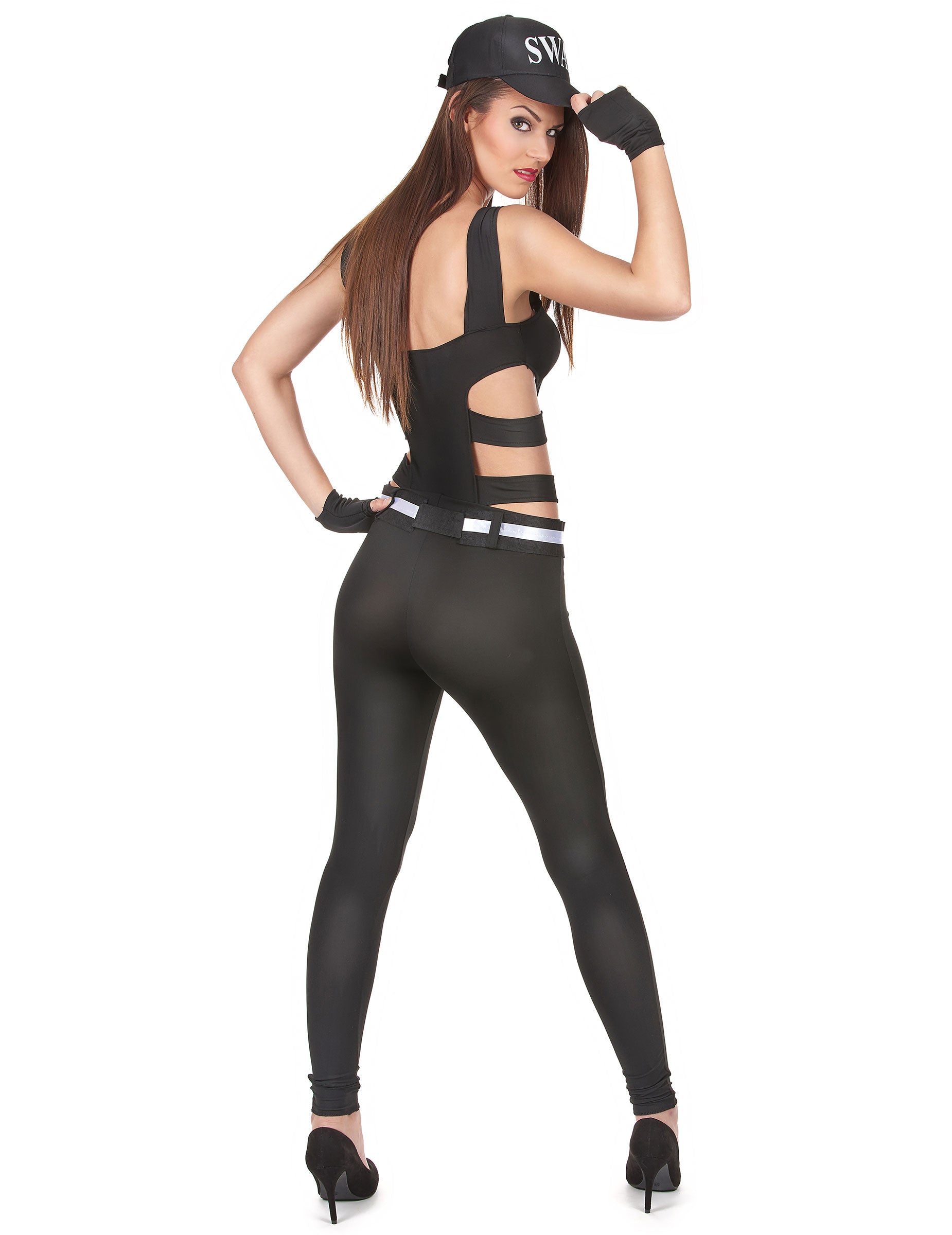 Този SWAT за прикриване на жените се състои от комбинация, капачка, колан и ръкавици (обувките не са включени). Стегната комбинация е черна с отвори на върха, на нивото на ребрата. Той е снабден с размера, за да може да постави колана. Тази комбинация се затваря отпред, използвайки дълъг цип. Черната капачка е отпечатана от надписа "SWAT" в бяло. Тя се затваря в задната част на главата с помощта на драскотина. Черният и сребърен колан се затваря с черен пластмасов контур. 2 -те ръкавици са черни. Този костюм ще бъде идеален за присъединяване към секси елитен отряд по време на прикрита вечер.