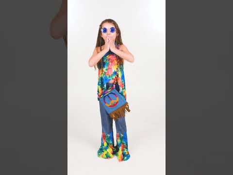 Този хипи за момиче маскировка се състои от топ и панталони. Изплашният гол гръб е оцветен с ярки цветове като червено, зелено или жълто. Той е еластичен отзад и се закрепва във врата, като се използва 2 връзки, които трябва да бъдат плетени. Съответстващите панталони са разпалени. Горната част е синя, за да даде ефект на Жан. Дъното на разпалените панталони възобновява същата материя като тази, използвана за върха. Този костюм ще бъде идеален за разглеждане на живота като хипи на парти на 60 -те или за карнавал.