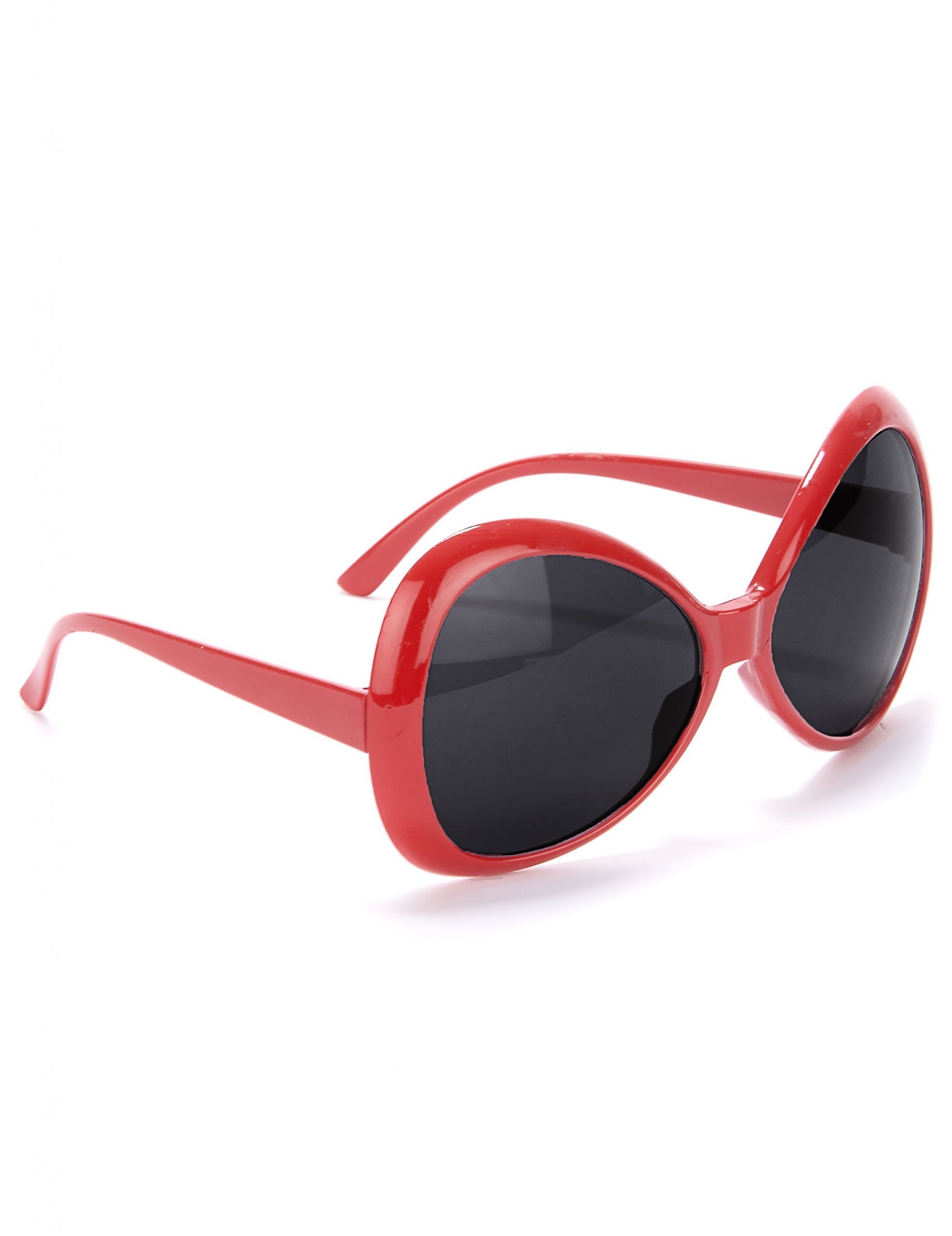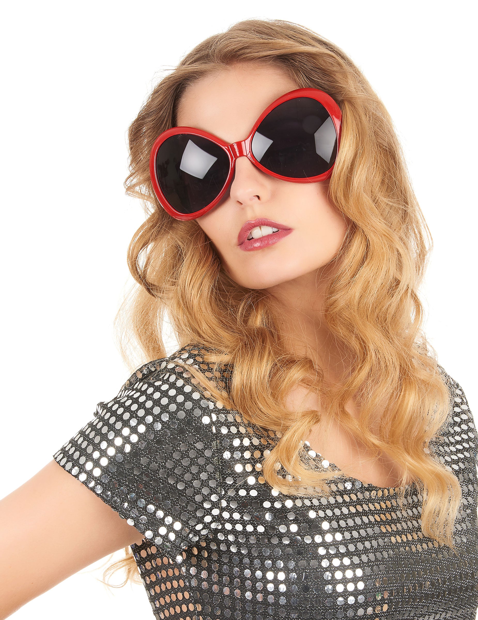 Тези диско очила за възрастни са червени. Те имат много големи рамки с кръгли форми, както и тонирани пластмасови очила. Тези очила са празнични аксесоари и в никакъв случай не представляват адекватна UV защита. Тези очила ще бъдат идеални за аксесоари за прикриване като крал на дискотеката по случай една вечер по темата от 70 -те години.