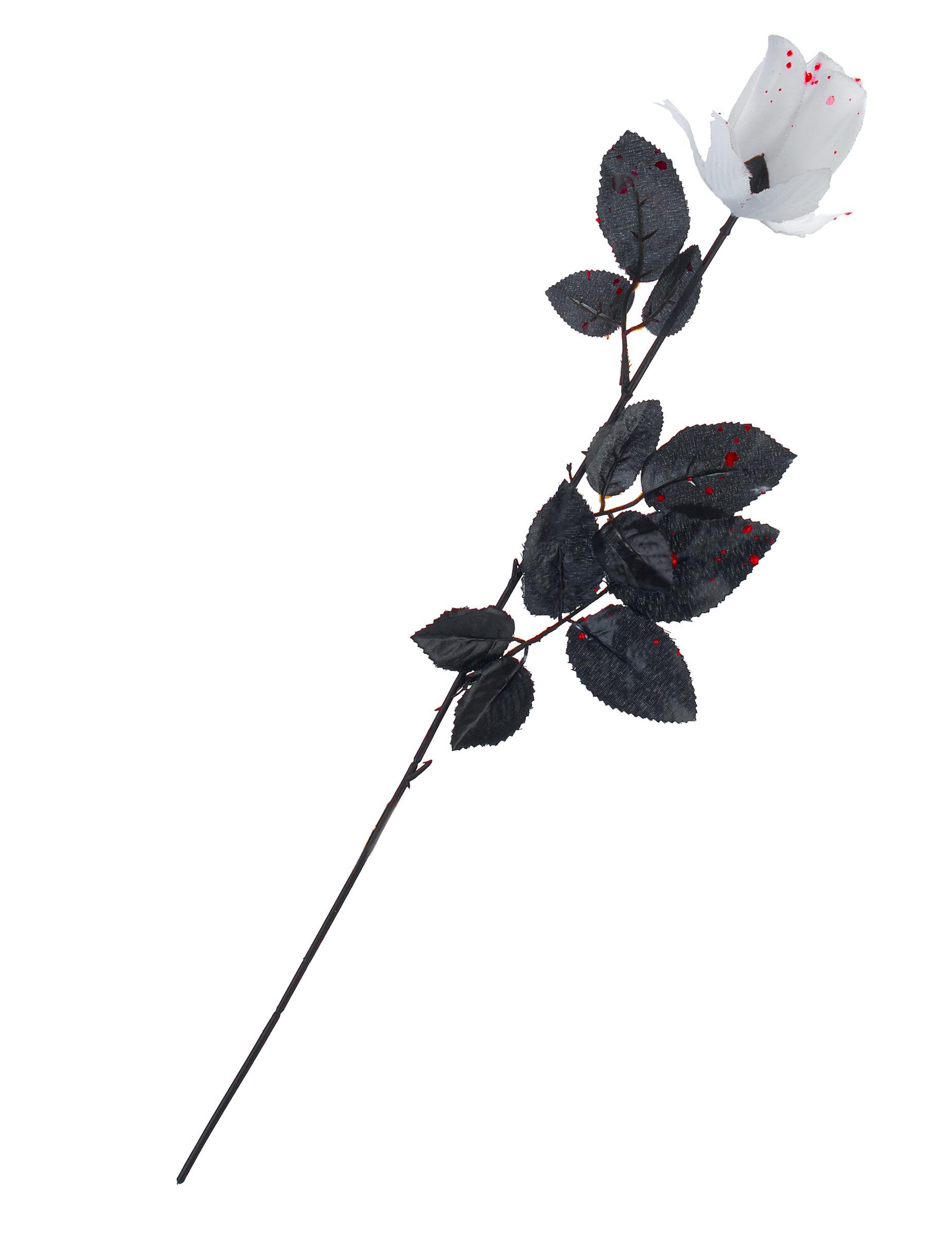 Тази бяла роза е кървава и е с дължина 45 см. Цветето има бели венчелистчета с черни листа. Те са изработени от плат с пластмасова пръчка. Намираме петна от фалшива кръв върху цялото цвете. Той ще бъде идеален за декорация в ден на Хелоуин или дори за завършване на маскировка.