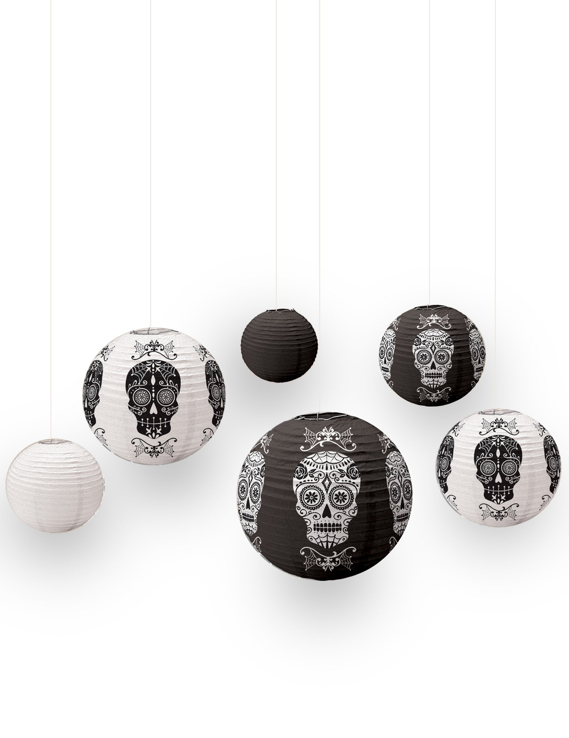 Тази партида се състои от 6 топки, които да висят на хартия с метални разширители и връв. 1 -вата топка е черна с мексикански мотив на смъртта на смъртта в бяло, тя е с диаметър 29,7 см. Вторият е бял със същия мексикански модел, но черен на цвят, той е с диаметър 24,6 см. Тогава ще намерите 2 други по -малки висящи топки (диаметър 19,5 см), които са абсолютно същите като първите 2. И да завършат 2 обединени топки, черно и по едно бяло, което всеки измерва диаметър 14,4 см. Тези хубави и оригинални декорации ще бъдат идеални за въвеждане на интериора ви по време на Хелоуин.