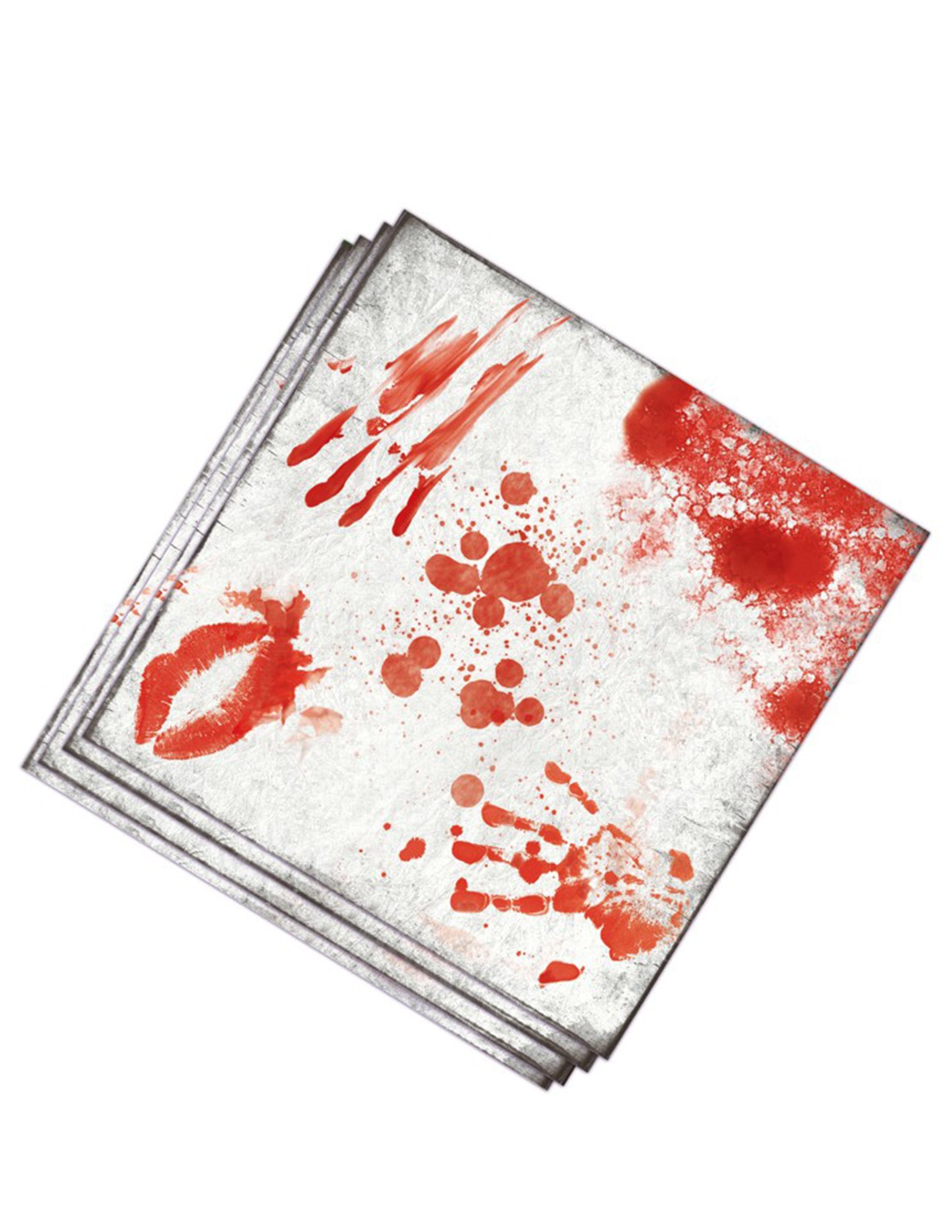 Този пакет се състои от 12 хартиени кърпи за Хелоуин. Те измерват приблизително 16,5 х 16,5 сгънати и 33 х 33 см веднъж се разгънат. Те са бели и имат червен принт, представляващ следи от кървави ръце и кръвни пръски. Тези кърпи ще бъдат идеални за декориране на вашата маса по време на Хелоуин.