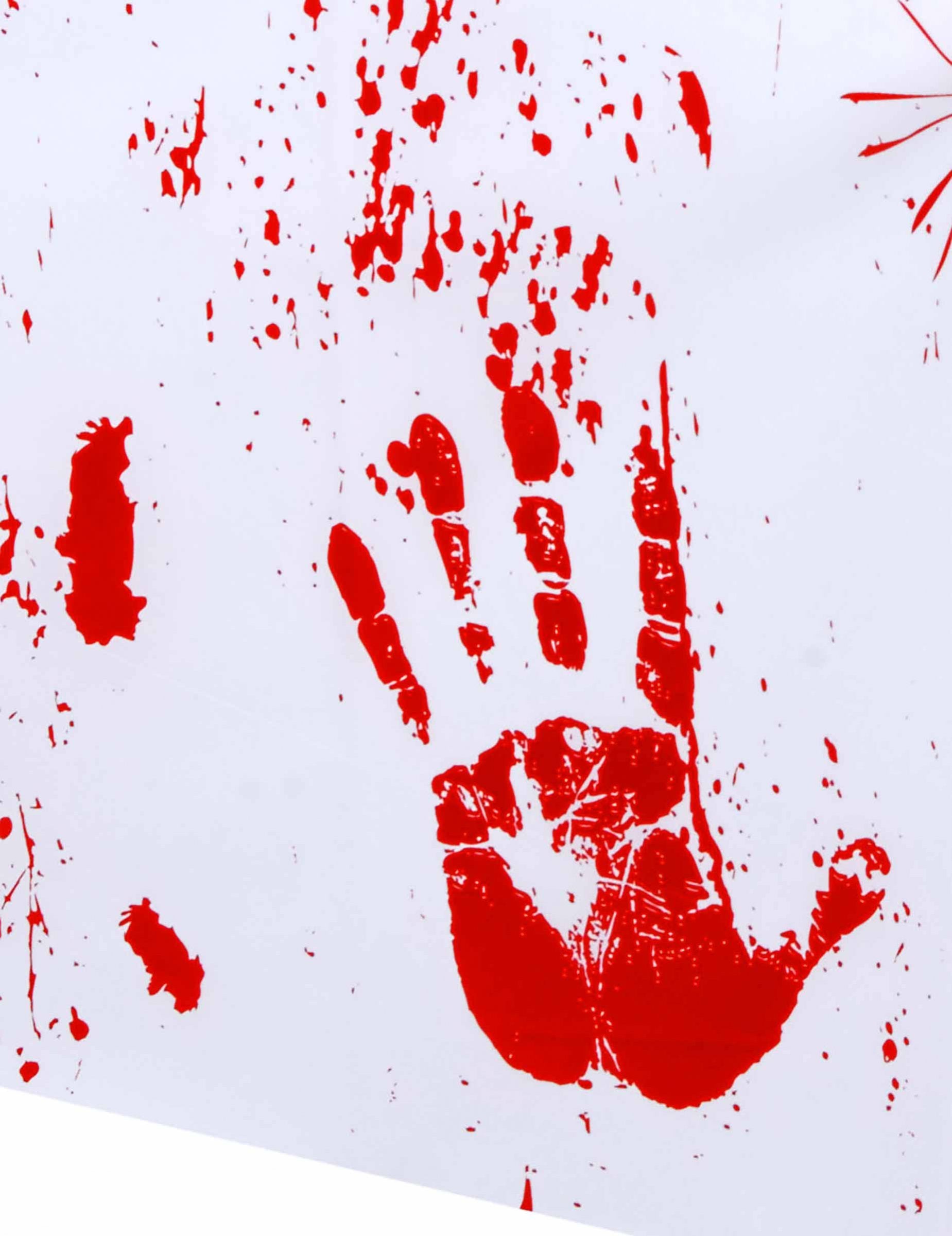 Тази площадка за Хелоуин е във фина пластмаса. Те измерват приблизително 137 cm x 274 cm. Бялата покрита покривка е покрита с пръски и кървави ръце. Тази покривка ще бъде идеална за създаване на плашеща атмосфера по време на Хелоуин.