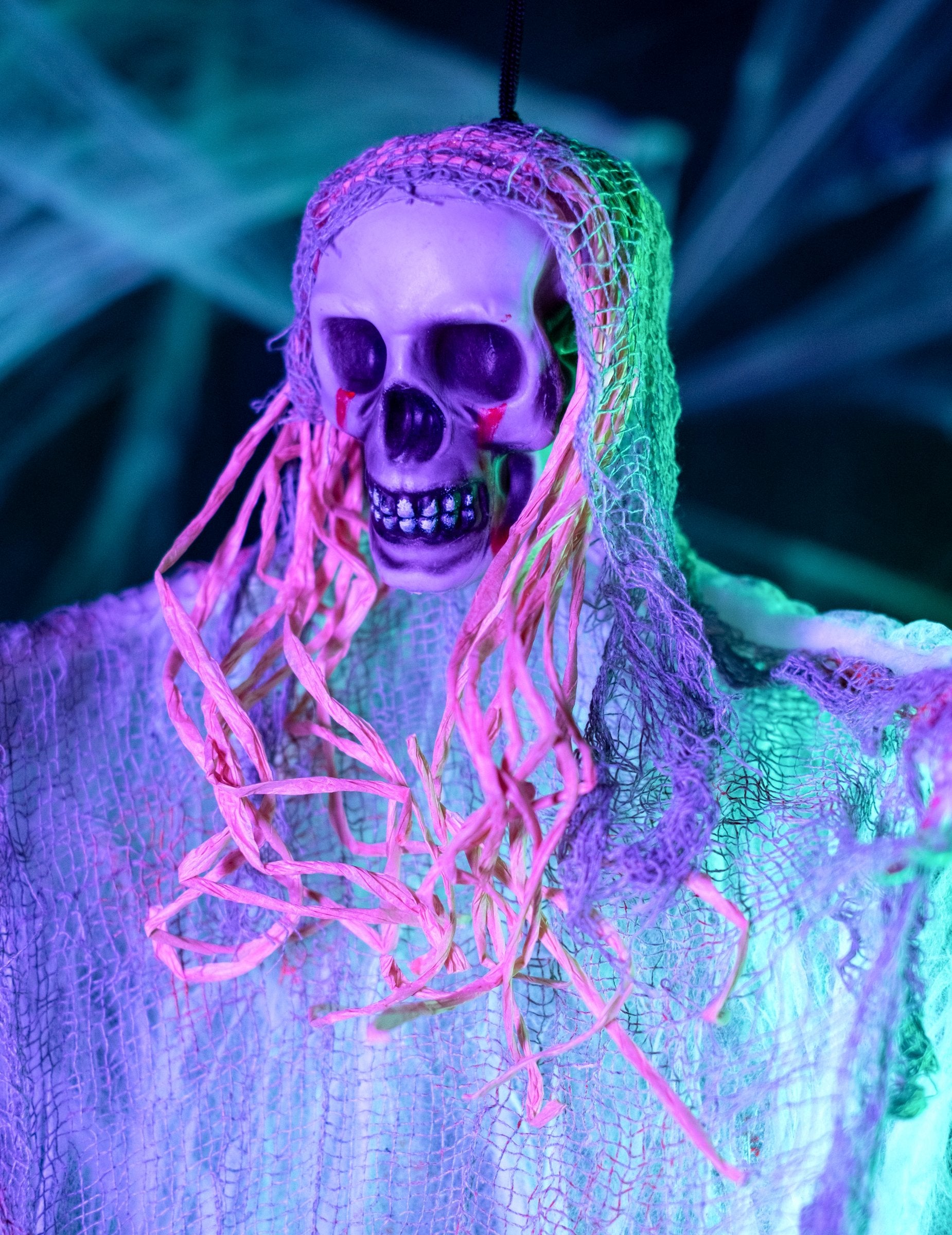 Тази украса на ужасите представлява скелет призрак. Той измерва около 35 х 90 см в бяло и оцветен с кръв, има пластмасова скелетна глава и скелет, както и фалшива сива коса. Останалата част от тялото е съставена от бяла материя, оцветена с фалшива кръв. Тази декорация измерва приблизително 90 см и има малка връзка върху черепа на скелета, за да го закачи, както желаете. Тази скелетна декорация ще бъде парафа, за да плаши вашите гости по случай Хелоуин. Copyright Widmann Srl