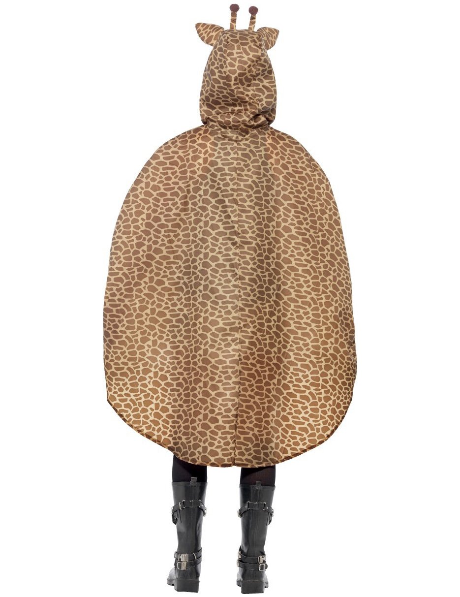 Това без ръкави на жирафа за възрастни е кафяво и пясък. Той има подходяща качулка, която представлява главата на жирафа. Всъщност качулката е декорирана с две заострени уши и две мини-царевица в горната част на главата. Тази качулка за печат на жираф може да се затегне около лицето ви, използвайки кафяви връзки, за да завържете отпред. Драдрата присъства и в основата на качулката, за да се позволи лесно да се носи това пончо. Голям джоб по отношение на корема ще ви позволи да плъзнете личните си предмети. Водоустойчив и лек, това пончо е по -дълъг отзад. Той е с размери приблизително 68 см отпред и 100 см дължина отзад (да не говорим за качулката). Това пончо се снабдява с малък подходящ джоб от 22 х 14 см, за да го транспортира лесно. Този Пончо Жираф ще бъде идеален за завършване на вашето облекло по оригинален и фантастичен начин по време на фестивали на открито или парти на темата на Савана.