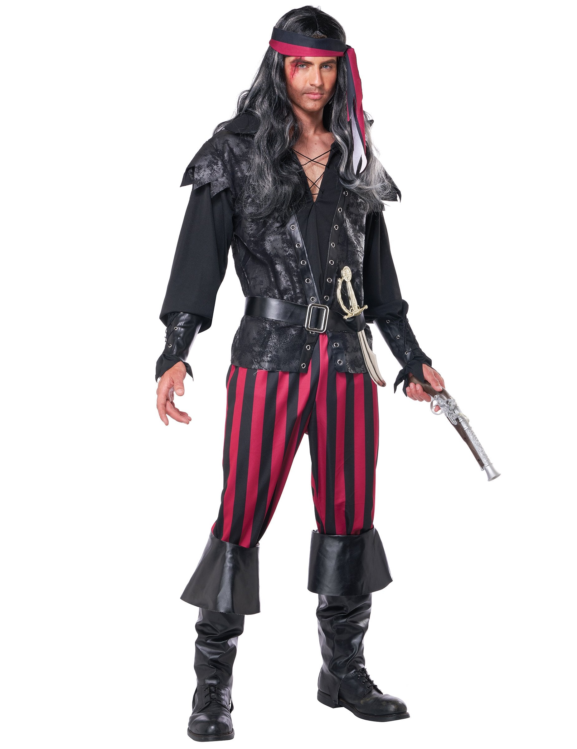 Тази пиратска маскировка за мъже се състои от връх с дълги ръкави, пантакурт, 2 маншета, колан, 2 ботуши и банер (сабя и очен капак не са включени). Черният връх с дълги ръкави има фалшива жилетка за ефект на кожата с ленти от фалшива кожа, върху които присъства. Pantacourt е раиран червен и черен. Размерът е еластичен за по -добра поддръжка. Маншетите са черни в фалшива кожа. Те ще бъдат коригирани благодарение на шнур, който да преминат в уши. Регулируемият черен колан има пластмасов контур със сребърен цвят. Ботушите от кожен ефект са черни, тя ще се запази благодарение на еластичния, който да премине под крака ви. Лентата за глава, която да завържете около главата ви, съвпада с Pantacourt. Този пиратски костюм ще бъде идеален за тематична вечер или за карнавал.
