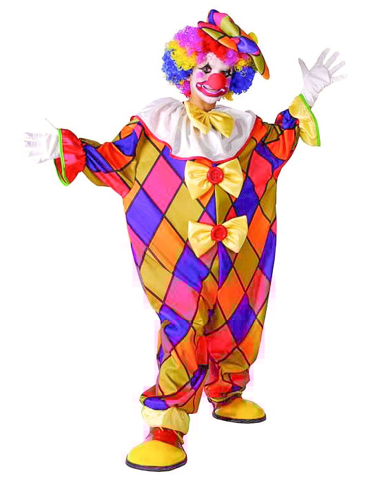 Този детски костюм представлява клоун. Той е съставен от комбинация, яка и шапка. Комбинацията е много широка за ефект на буфон. В многоцветния полиестер е направен от диаманти. Големите жълти възли с червен бутон са фиксирани на гърдите. Краят на ръкавите е подпухнал благодарение на еластиците. Бял пропуск поставя на врата. В полиестер има голям жълт възел в центъра. Шапката поема моделите на комбинацията. В центъра е фиксиран жълт помпом. Оставете детето ви да има измислици на рождения си ден или за шоу.