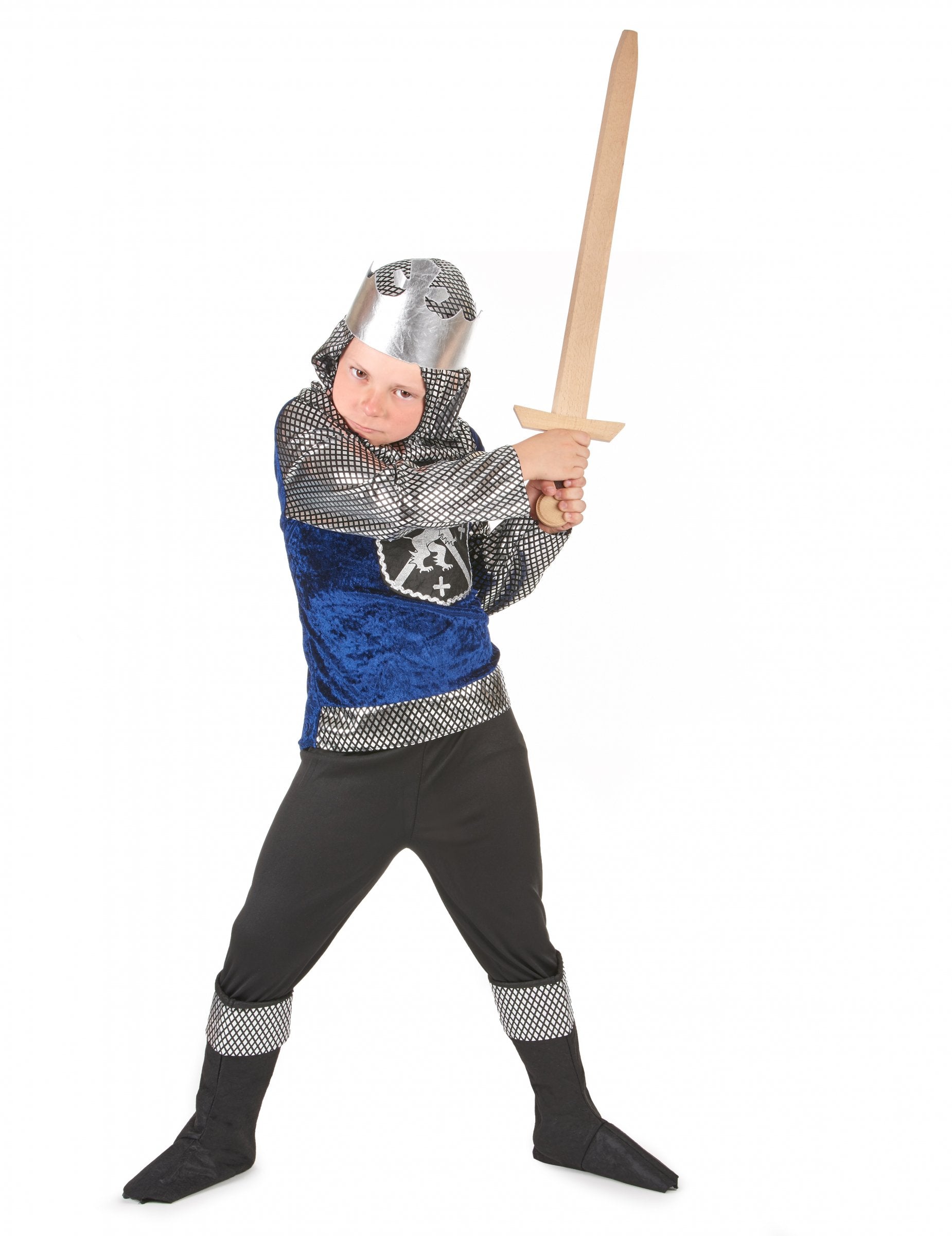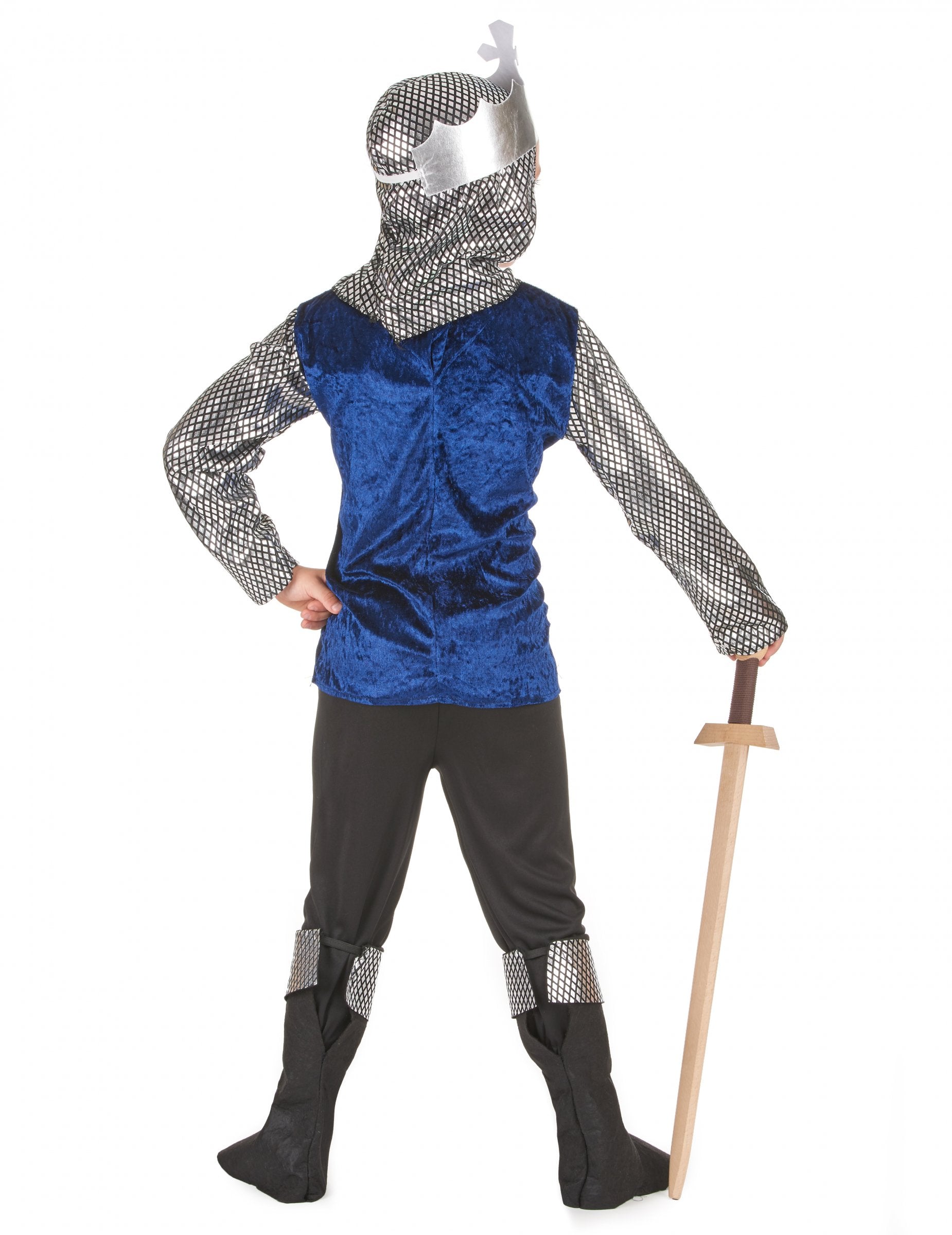 Този детски костюм представлява рицар. Състои се от туника, качулка, корона, панталони и ботуши (обувки не са включени). Туниката е дълги ръкави. Тези ръкави имат диамантени модели, които симулират вилата на мрежи. Ивица от тази тъкан е пришита на дъното на тениската. Сандът е в син полиестер с ефект на кадифе. Герб е пришит на гърдите, който представя лъв в кръст, знак за вярност на суверен. Черните панталони са изработени от полиестер и са частично скрити от черни суи. Качулката е направена от полиестер и покрива главата. Лицето е разкрито, но преодоляно от корона. Тъканта припомня туничната мрежа. По време на закуска или карнавал за рожден ден, вашият син ще може да покаже таланта си на мечове, като носи този костюм на защитника.