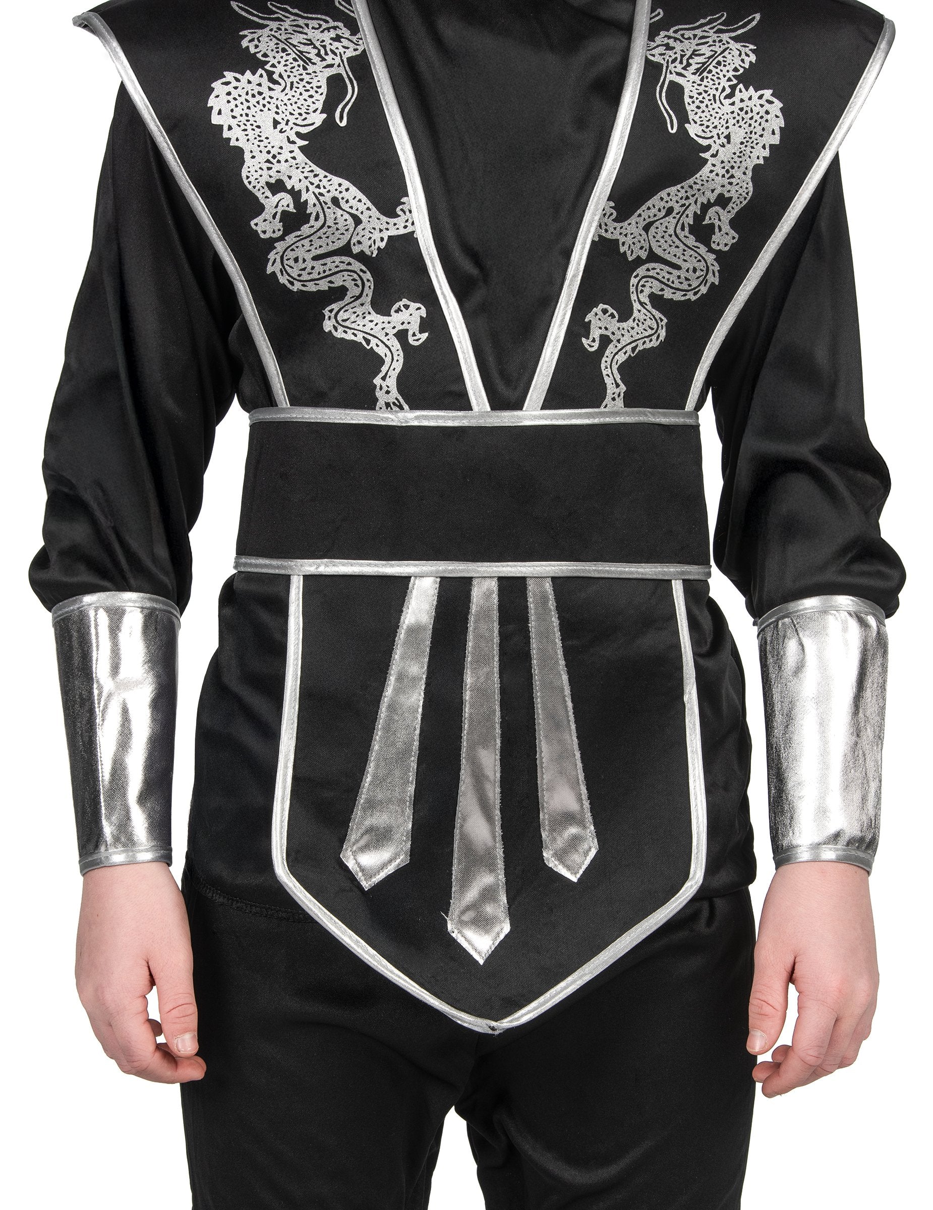 Този костюм на нинджа е за момчета. Включва тениска, протектор за гърдите, панталон, колан, клин, ръкави и качулка. Тениската е черна, закопчава се с велкро лента зад врата. Дългите ръкави са покрити със сребърни маншети, които се прикрепят с велкро. По-твърдият нагръдник симулира бронята на този самурай. Сребрист бордюр следва очертанията на плата. Отстрани на нагръдника са отпечатани два сребърни дракона. Свободните черни панталони имат ластик на талията за добро прилягане. Долните крака могат да се държат със сребърни лепенки за крака. Върху нагръдника и панталона ще се носи черен колан, който също се закопчава с велкро. Качулката е черна. Покрива изцяло главата и оставя очите и носа видими. За карнавал или рожден ден вашето малко момче може да покаже уменията си на нинджа.