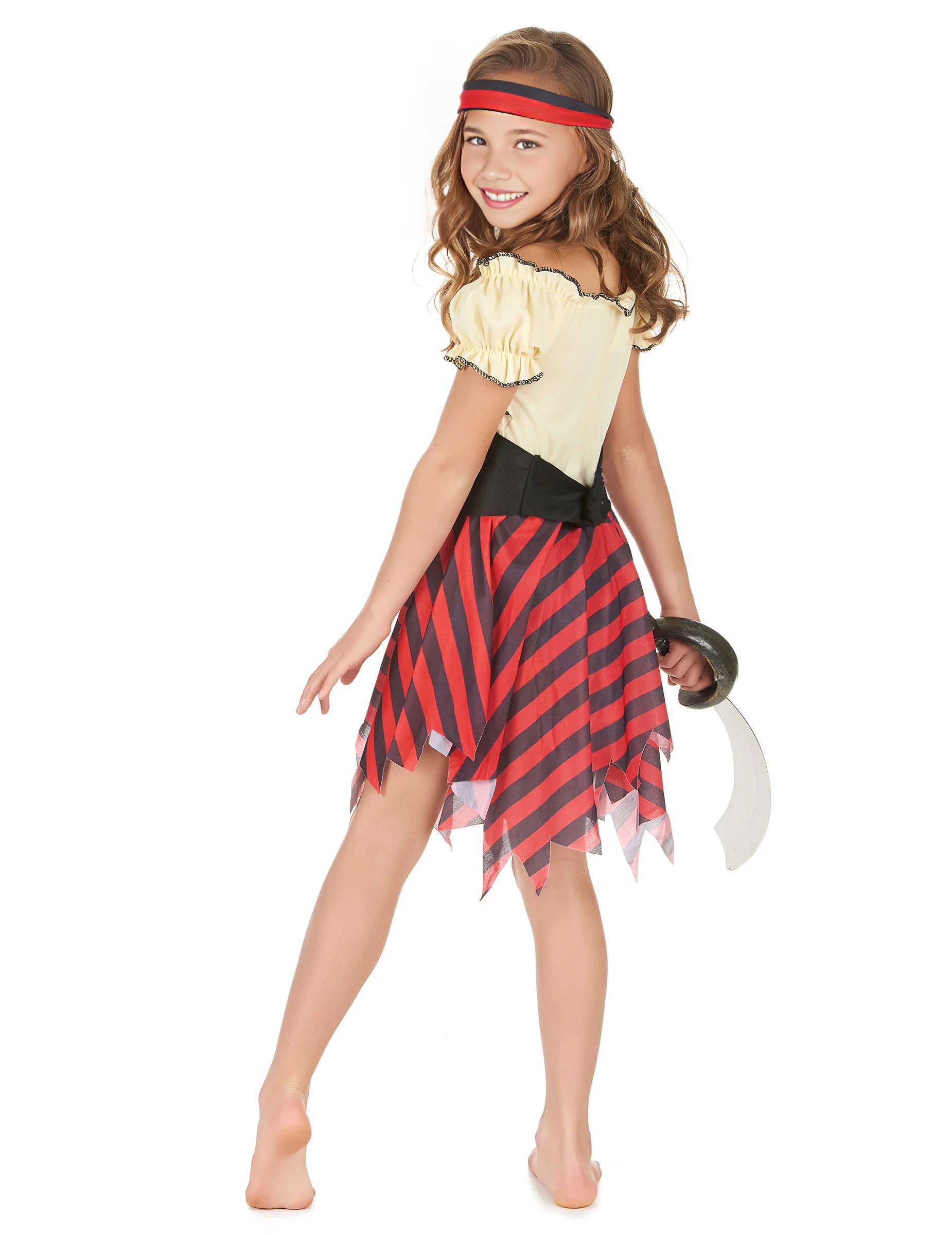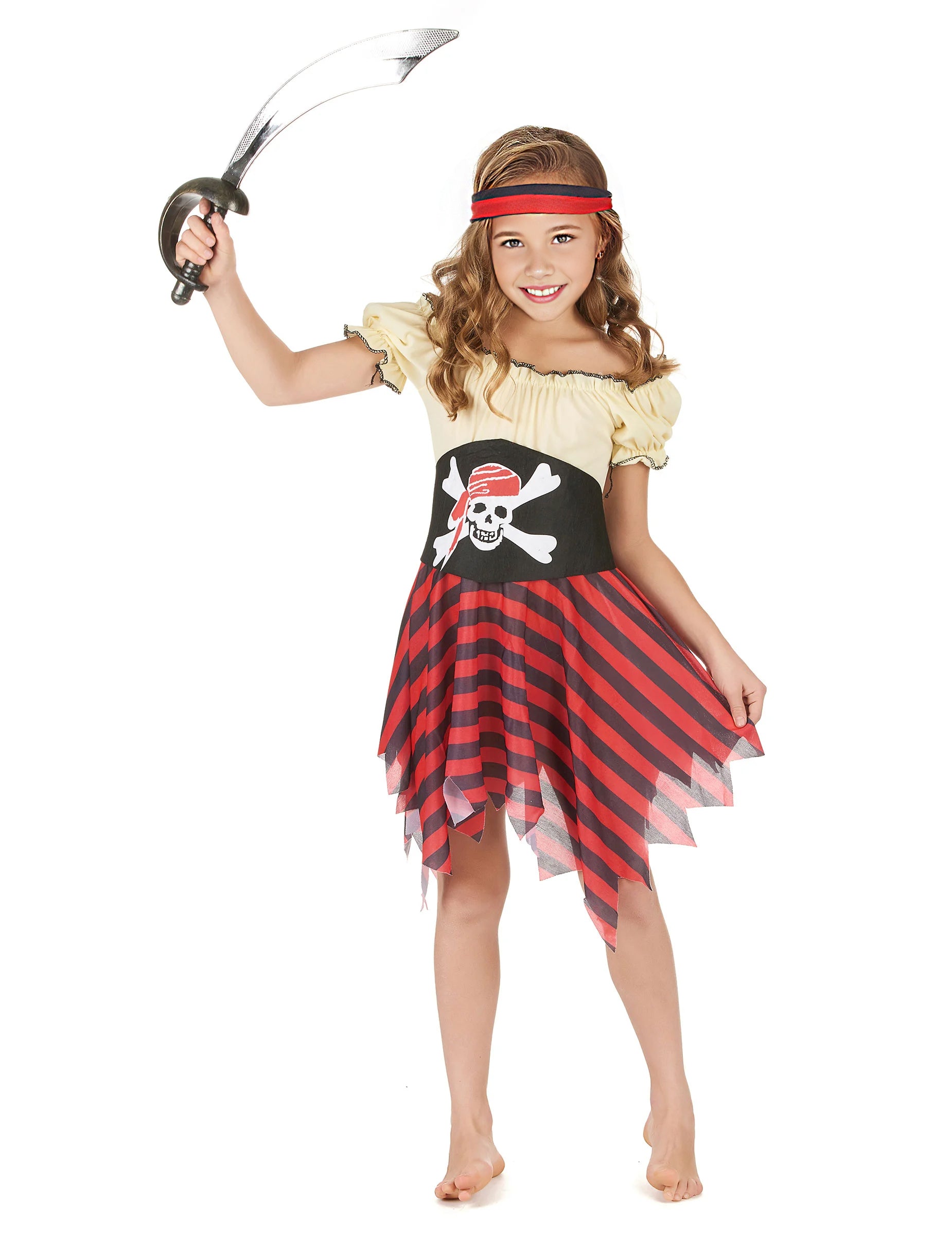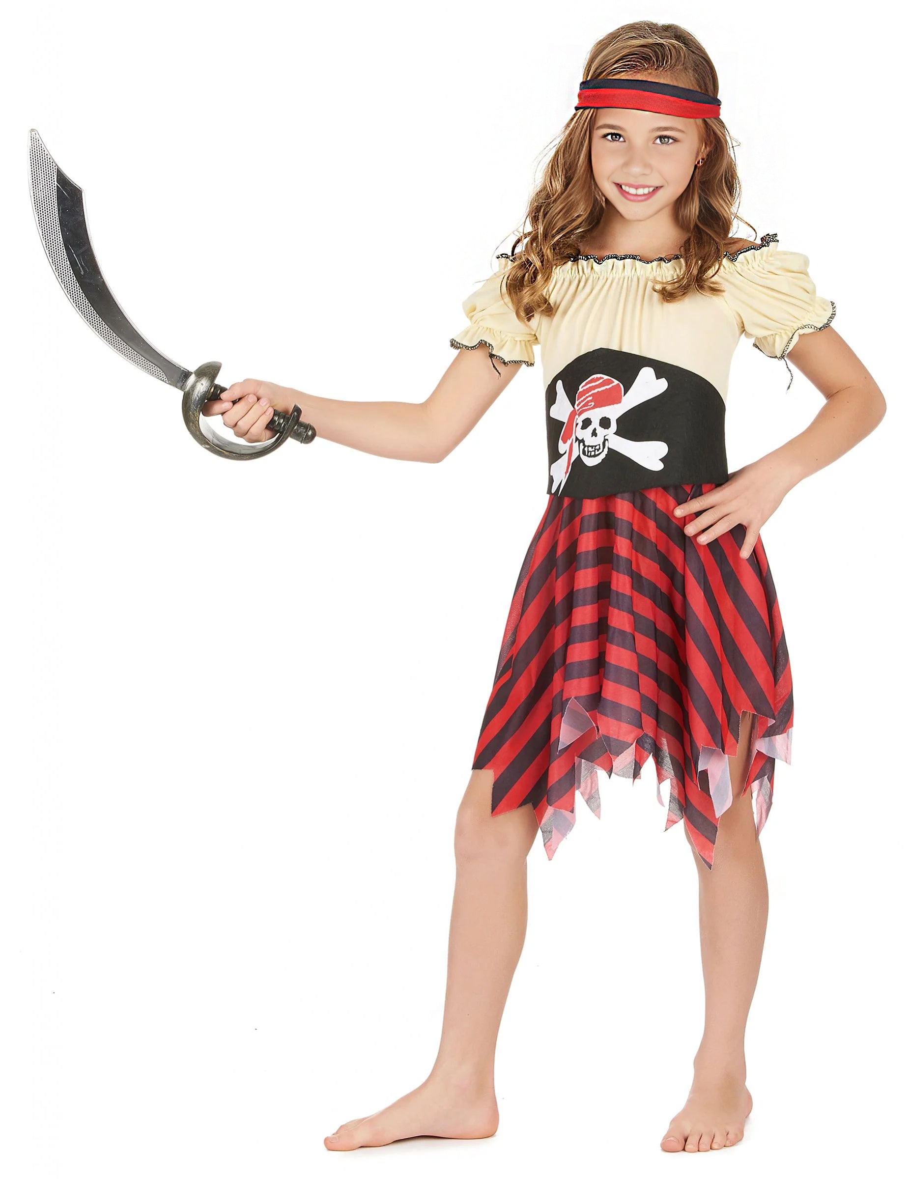 Този пиратски костюм е за момиче. Състои се от рокля, колан и банер (сабя не е включена). Горната част на роклята е жълта с къси ръкави е подпухнала. Черно шевово се вижда на деколтето и ръкавите. Петикоатът е с два колора. Червените и черните хоризонтални ивици са украсени с ефективен ефект с рязане на върхове от дъното на полата. Широкият колан подчертава размера. Известният череп е привлечен от централната част. Лентата за коса е с два тона. По време на прикрит рожден ден дъщеря ви ще бъде перфектен размишляващ на моретата.