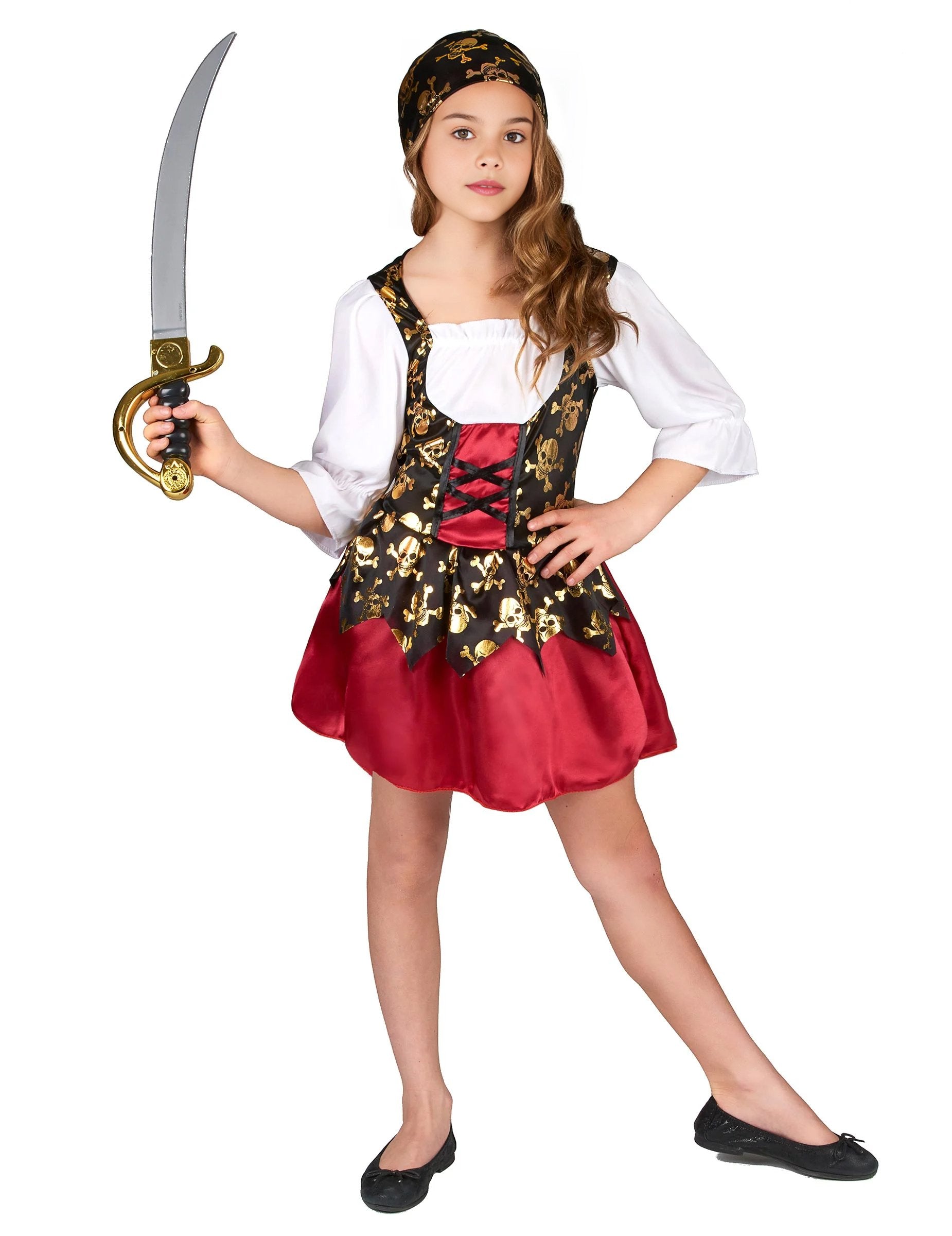 Тази пиратска маскировка за момиче включва рокля и лента за глава (не са включени обувки). Роклята е много елегантна. При полиестер подпухналите ръкави и деколтето са бели. Петикоатът е сатенено червен и черен воал със златисти черепи покрива част от гърдите и бедрата. Черните дантели подчертават размера. Тази рокля лесно се поставя без затваряне. Костюм с малък размер. Голяма черна полиестерна шапка ще покрие главата, която съответства на роклята със златни черепи. По време на прикрита закуска дъщеря ви ще бъде много женствен корсар. Този костюм с малък размер.