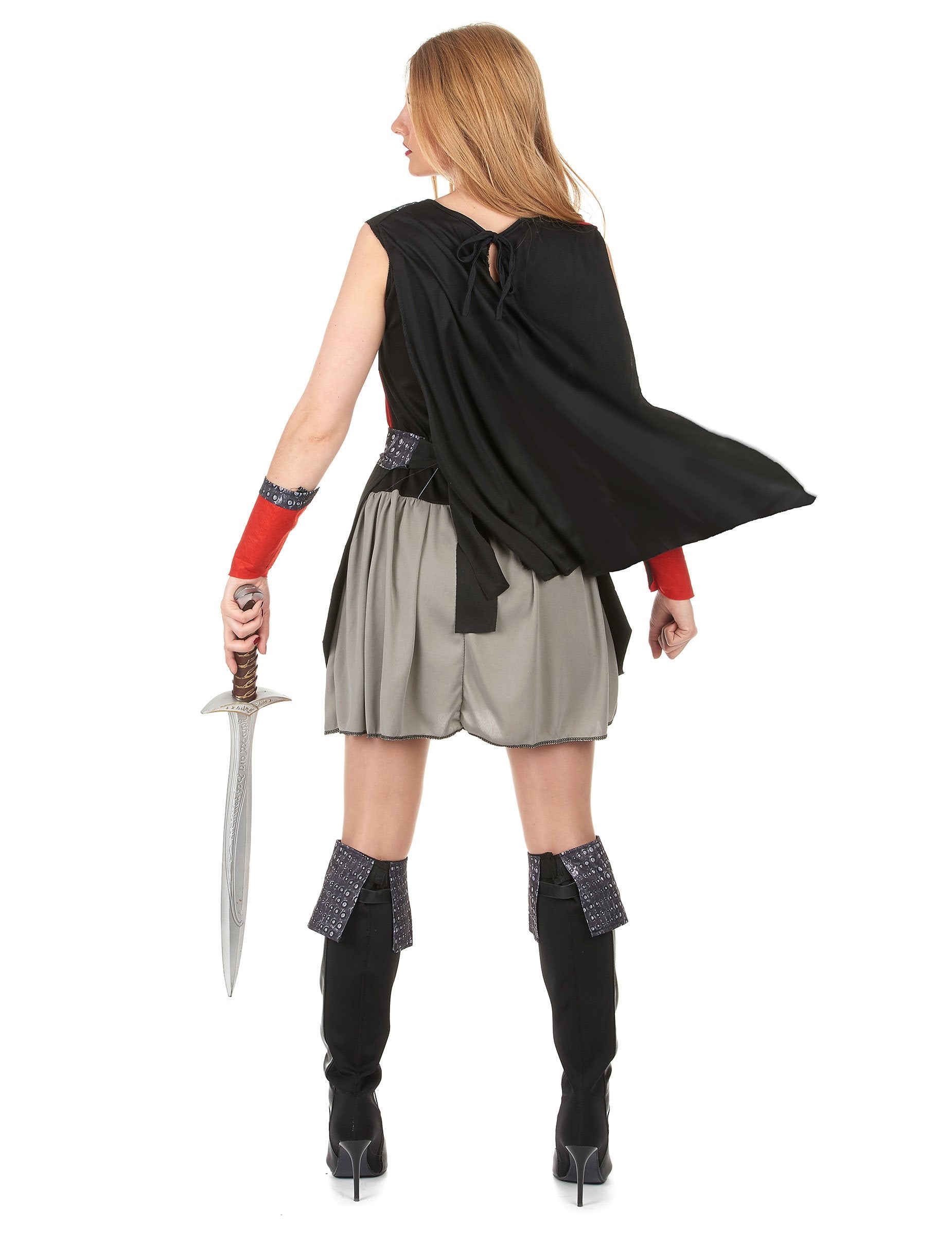 Тази маскировка на средновековен рицар за жени включва рокля с нос, колан, ръкави, суинг (обувки не са включени). Роклята е без ръкави и тя се затваря на врата с дантела. В горната част има четири големи черни и червени квадратчета. Кръглата шия е Sturcade с кожена материя за принт с малки изтеглени нокти. Значка се пришива на гърдите, представляващи сребърен лъв. Петикоатът е сив и фин. Коланът може да се позиционира на кръста, за да симулира броня. Черните ленти за тъкани са завършени с точкови съвети. Червените ръкави трябва да се носят на китките. Те се затварят с помощта на драскотини. Напомняне за ноктите присъства в единия край на маншетите. Кожените ефекти могат да се фиксират от велкро над ботушите, например за материализиране на облицовка. По време на вечер по темата за Средновековието носете честта на костюма на този войник.
