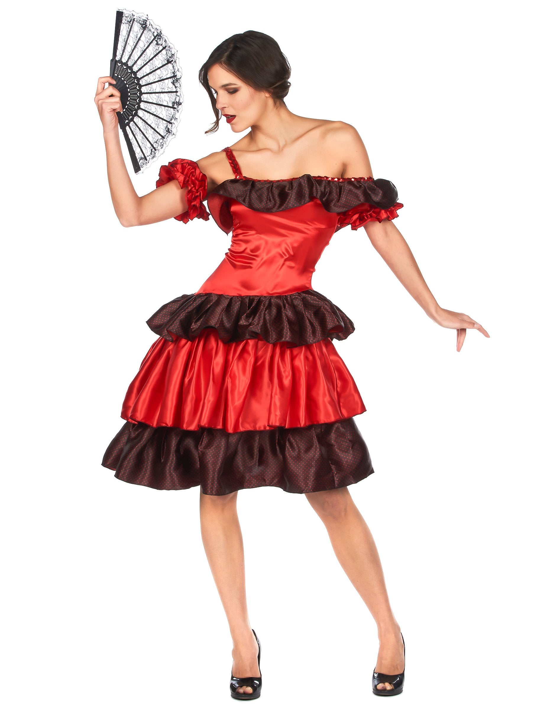 Този костюм за възрастни предизвиква андалуска танцьорка. Тя включва рокля, ленти и клипове за коса (обувките не са включени). Роклята е с два тона. Състои се от няколко искрящи червени и черни червени ръбове. Яката е асиметрична с една рампа. Черните и червените кули на оръжията във формата на еластичната коса трябва да бъдат поставени на ръцете, за да завършите това облекло. Черните клещи за коса са преодолени от искрящо червено полиестерно цвете. По време на латински вечер или за карнавал запалете стаята с испански танци!