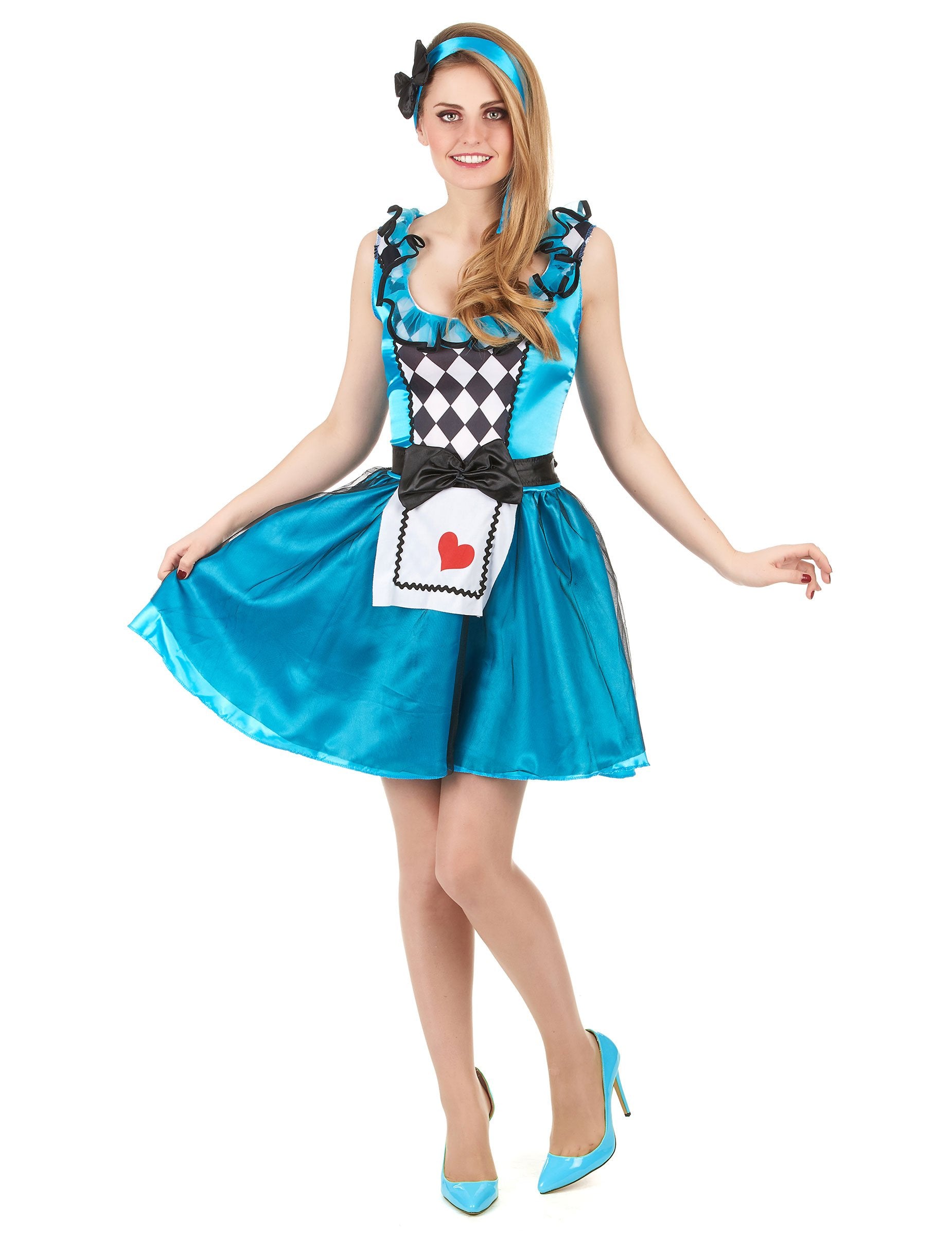 Този костюм за възрастни представлява младо момиче в въображаемата страна. Тя включва рокля с престилка, колан и лента за глава (не са включени обувки). Роклята е изработена от сатенен син полиестер. Без ръкави тя има фини -пожала на пръчки по списателите. Черната воалска фурна покрива синята пола и бял воал в рибена мрежа дава обем на цялото. На гърдите се пришива лента от карирана материя, за да симулира престилката. Дъното на престилката е бяло с черна граница и голямо червено сърце. Колан със сатен черен възел с размери 16 х 9 см подчертава кръста. Лентата за глава е същата сатенено синьо като роклята. Той е с размери 84 x 6см. Голям черен възел от 11 х 9 см е пришит на върха. Прикрийте се като оригинална дама на сърцето, ако сте поканени на тематична вечер.