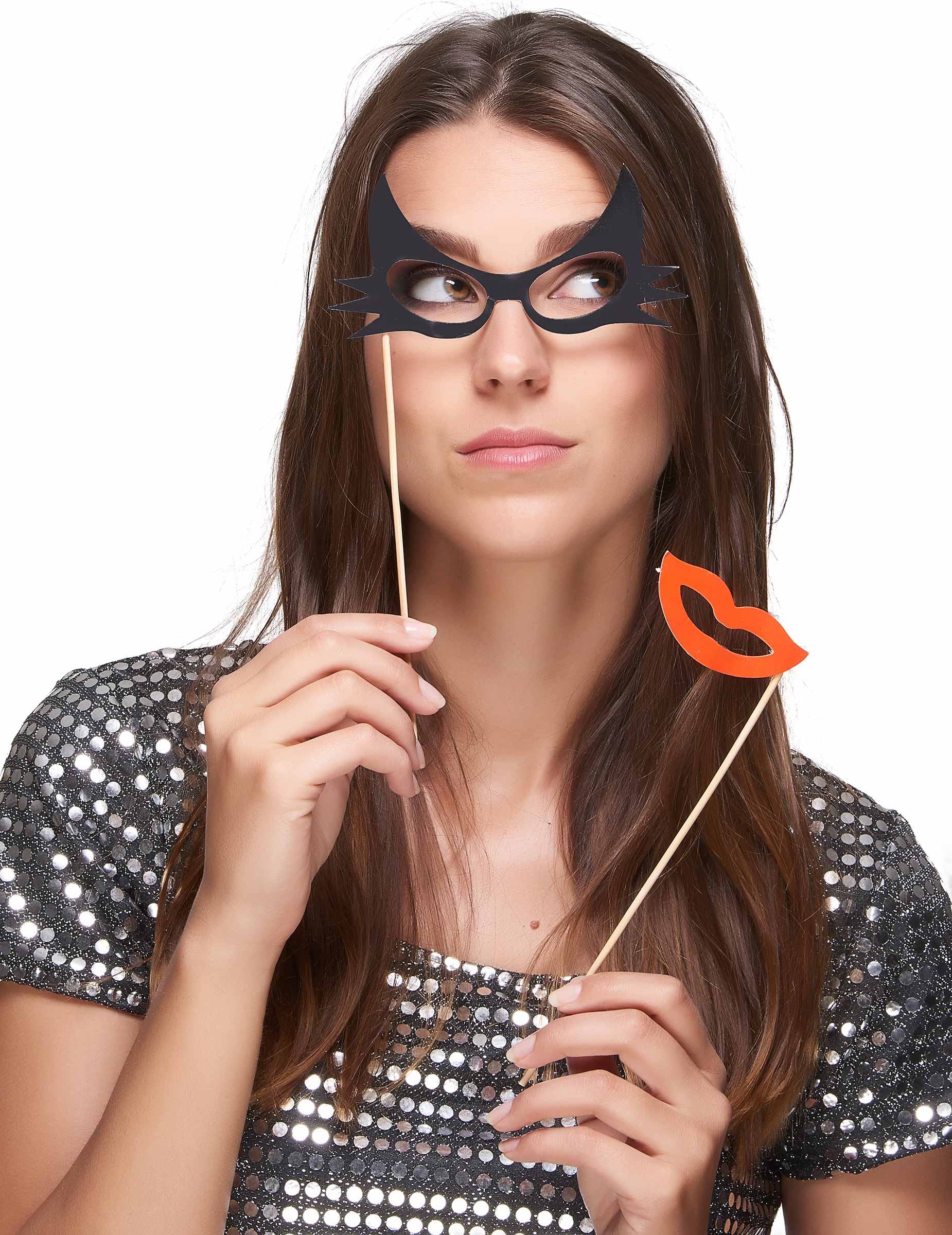 Този фотобучен комплект съдържа 12 картонени парчета. Ще намерите: - 4 червени уста - 4 черни мустаци - 3 чифта черни очила: чифт кръгли очила, двойка на затвора и чифт котешки очила. - Черна пиратска очна покривка. Всеки елемент е фиксиран върху дървена пръчка, височина приблизително 17 см. Правете снимки с този комплект и запазете незабравими спомени от вашата сватба или рожден ден.