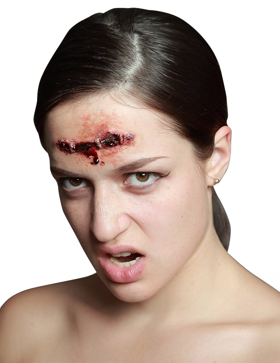 Тази фалшива рана представлява контузия на закрепене. Поставен на челото, латексът симулира дълбок и кървав прорез, зашеметен, колкото е възможно най -добре със скоби (лепилото не е включено). Придружител или приятел на създанието на Франкенщайн, този грим ще бъде идеален за Хелоуин.