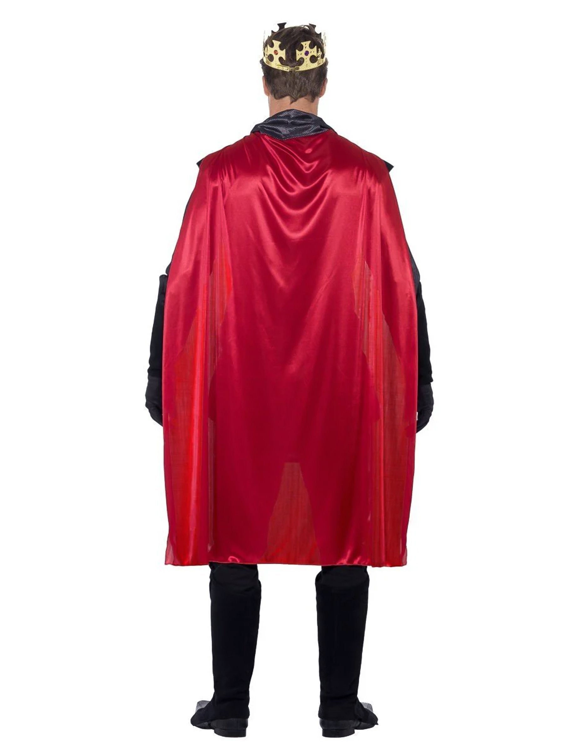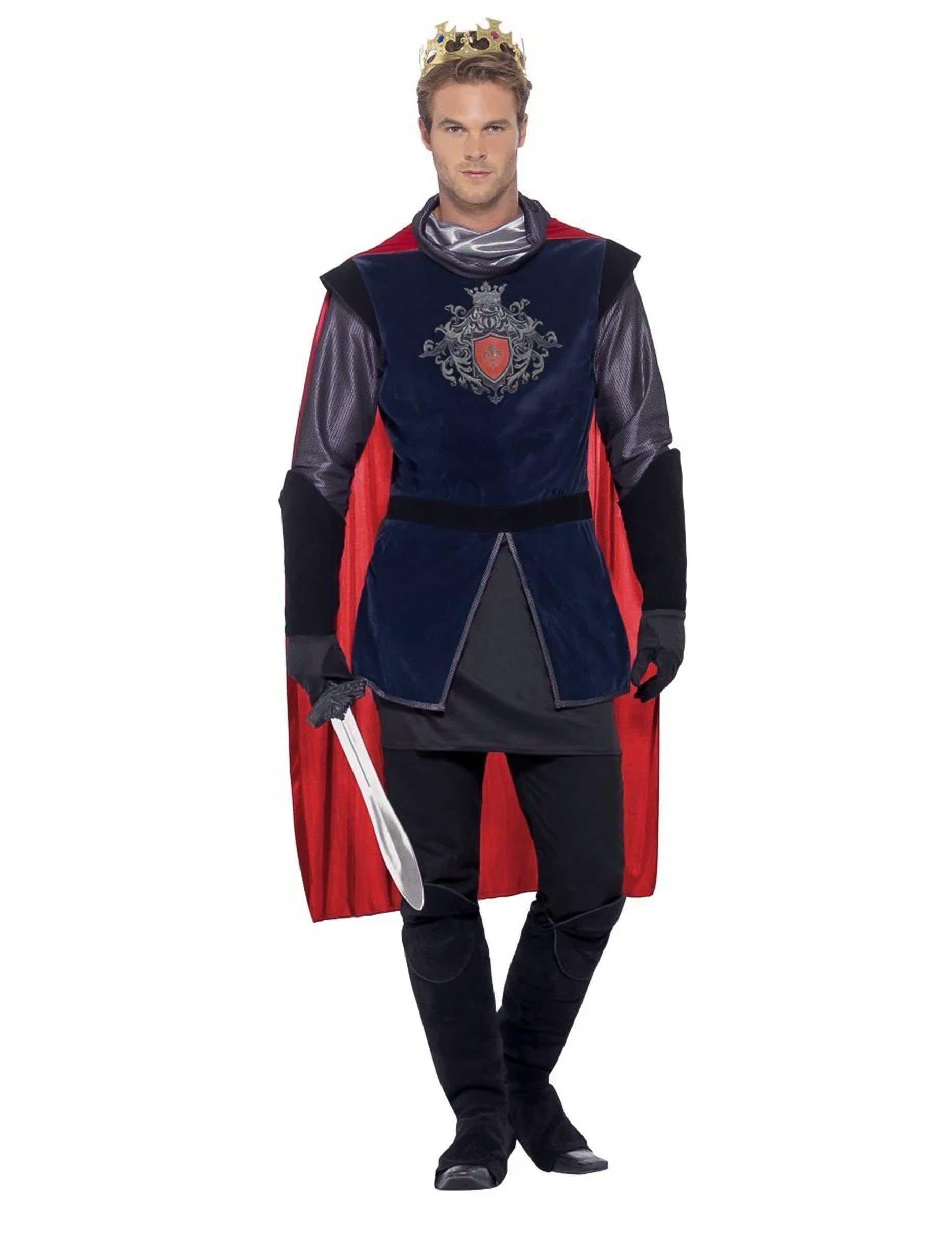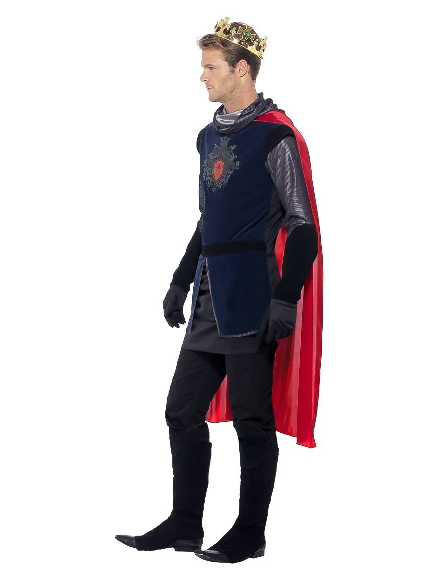 Това прикриване на средновековен крал за мъже се състои от висок, нос, чифт ръкавици, суи и корона (меч, панталони и обувки не са включени). Тъмносиният връх е направен в тъкан от велурен ефект отпред. В торса се стича и средновековна значка. Отзад този връх е обикновен черен. Дългите сиви и черни ръкави носят красиво палто от мрежа. Този връх се затваря отзад, използвайки драскотина. Дългият нос е червен, с голям ефект на яка. Този нос е поставен като тениска, без да се затваря. Ръкавиците са черни, в гъст велурен ефект в предмишниците. Материята е по -фина и еластична в ръцете. Съответстващите сури се поддържат под краката, като се използват еластици. Накрая пластмасова корона завършва костюма на този крал. Това има 3 нива на затваряне, за да се адаптира възможно най -добре. Костюмът на този крал ще бъде идеален за царуване над вашето царство за средновековна вечер.