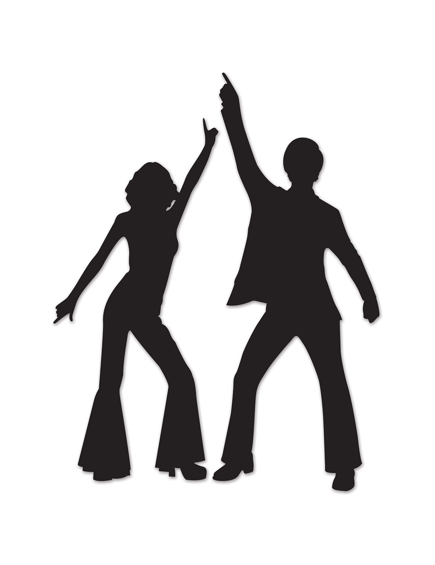 Тези 2 черни декорации на диско танцьори представляват силует на жената и силует на мъжа. Декорацията на жените е с височина около 83 см и мъжки декор около 93 см. Те ще бъдат идеални за декориране на стените ви за ретро вечер.