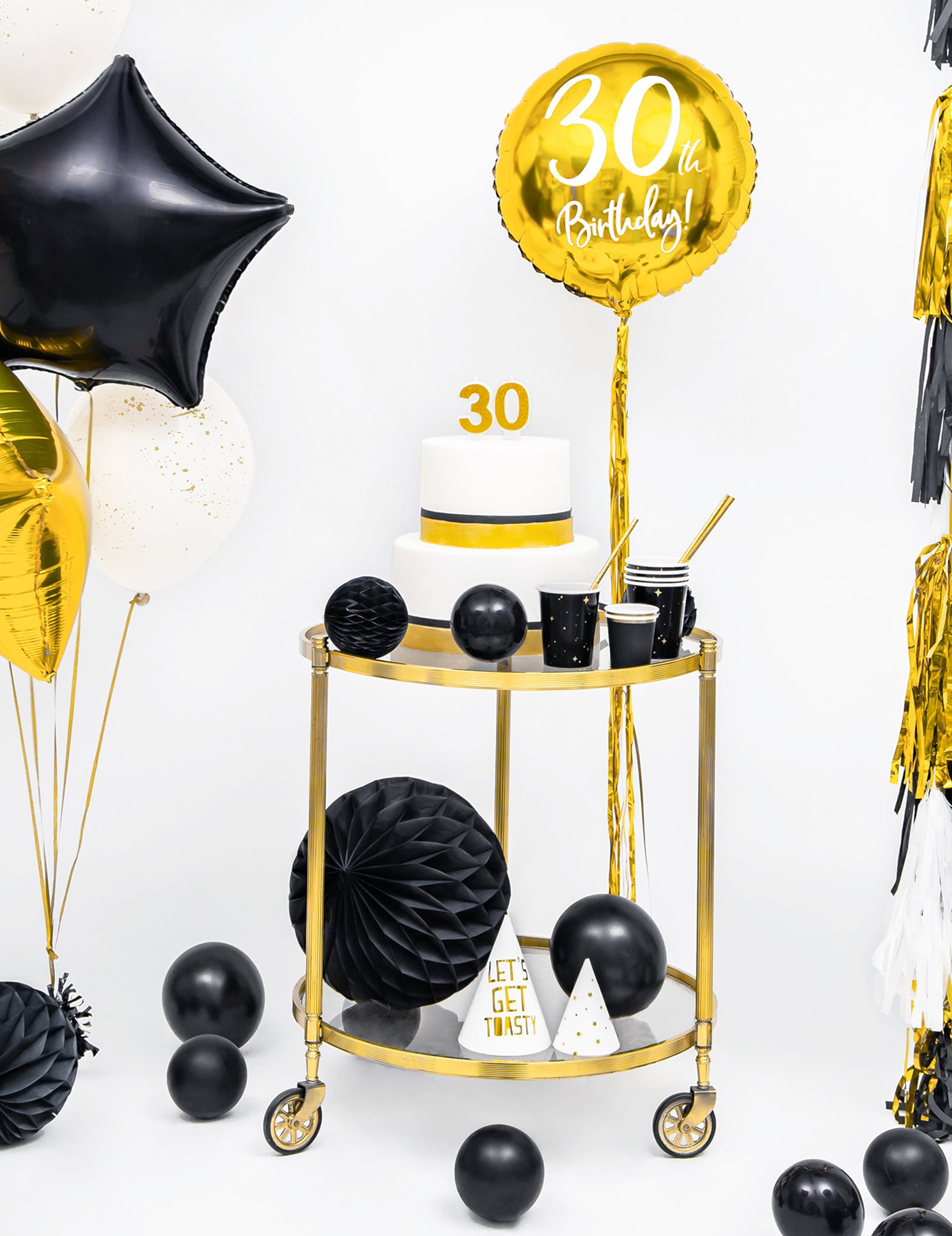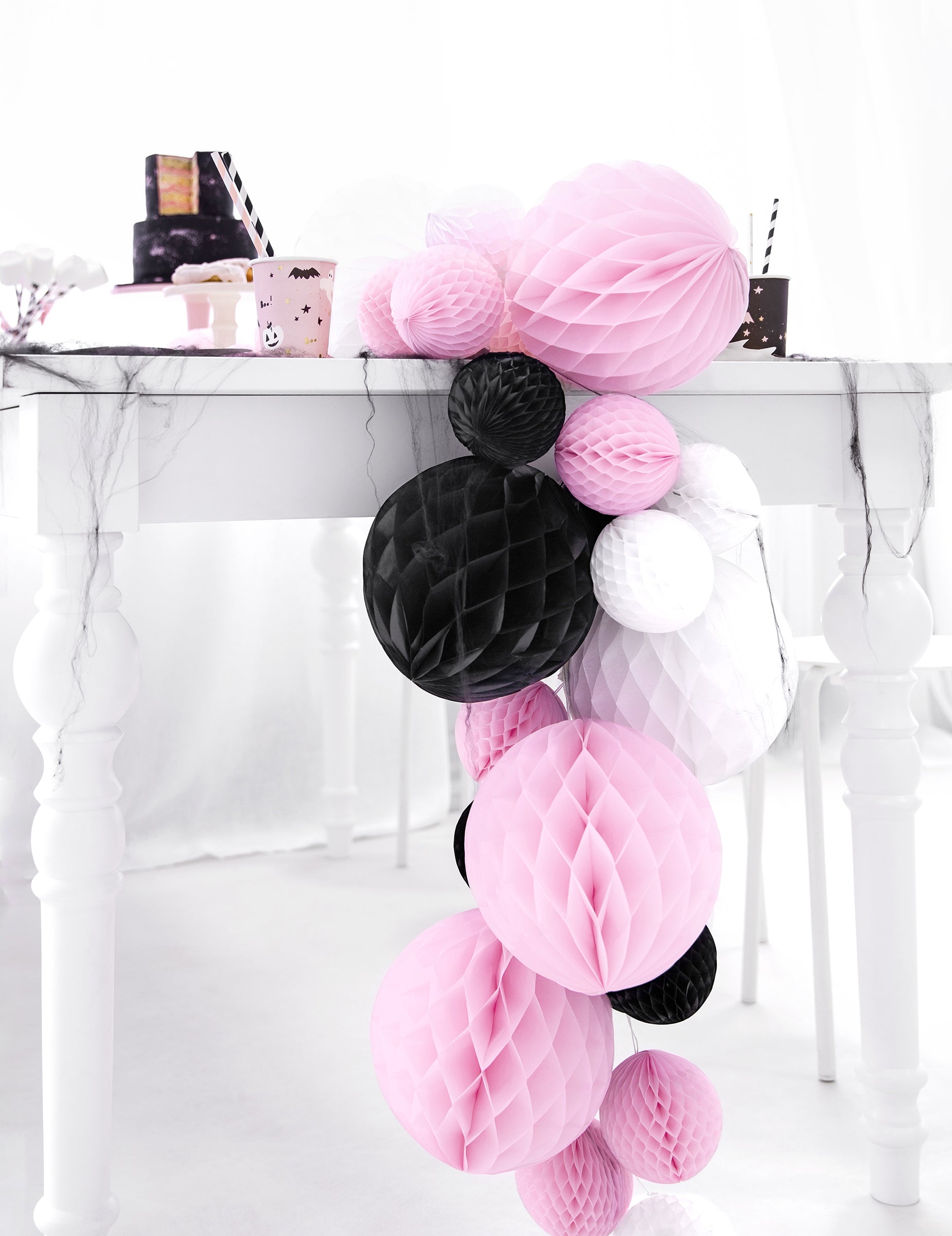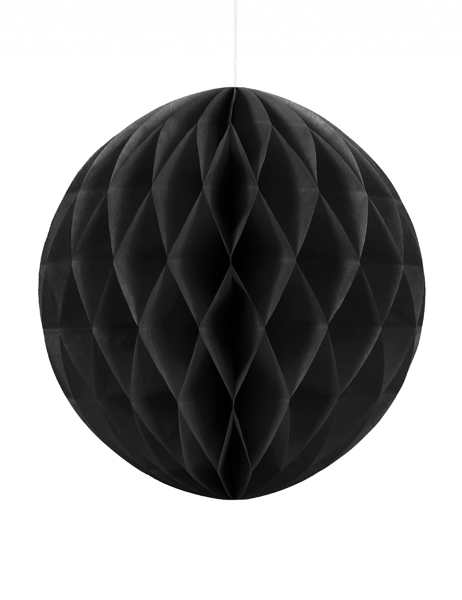 Това окачване е декоративна топка от около 20 см. Тя е в черна хартия за пчелна пита. Можете да го закачите благодарение на малка бяла струна. За вашата декорация на Хелоуин това окачване ще бъде перфектно на тавана, свързано с други черни и оранжеви топки. Уникално парти за брандиране