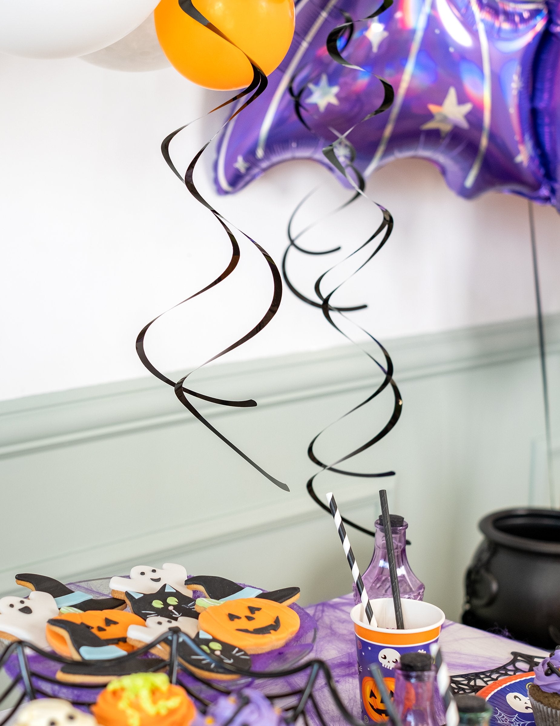 Тези 8 суспензии са изработени от пластмаса. Това са черни спирали с дължина около 66 cm. Те правят метален ефект. Закачете тези декорации, за да висите на тавана си за гарантиран ефект по време на вашето парти за Хелоуин. Уникално парти за брандиране