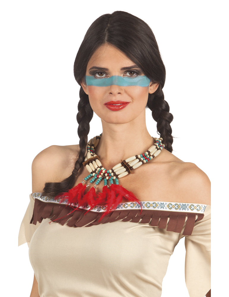 Тази жена колие с размери 78 cm. Фалшивите кръгли и овални перли са монтирани на бяла струна на 4 нива. Хубаво оцветено с тюркоазено синьо, червено и кафяво, това колие е вързано на врата благодарение на филцките връзки. Шест червени плумета от 10 см се спускат в деколтето. Маркирайте индийската си рокля, като носите тази дървесна огърлица по време на вечер по темата на Далечния Запад.