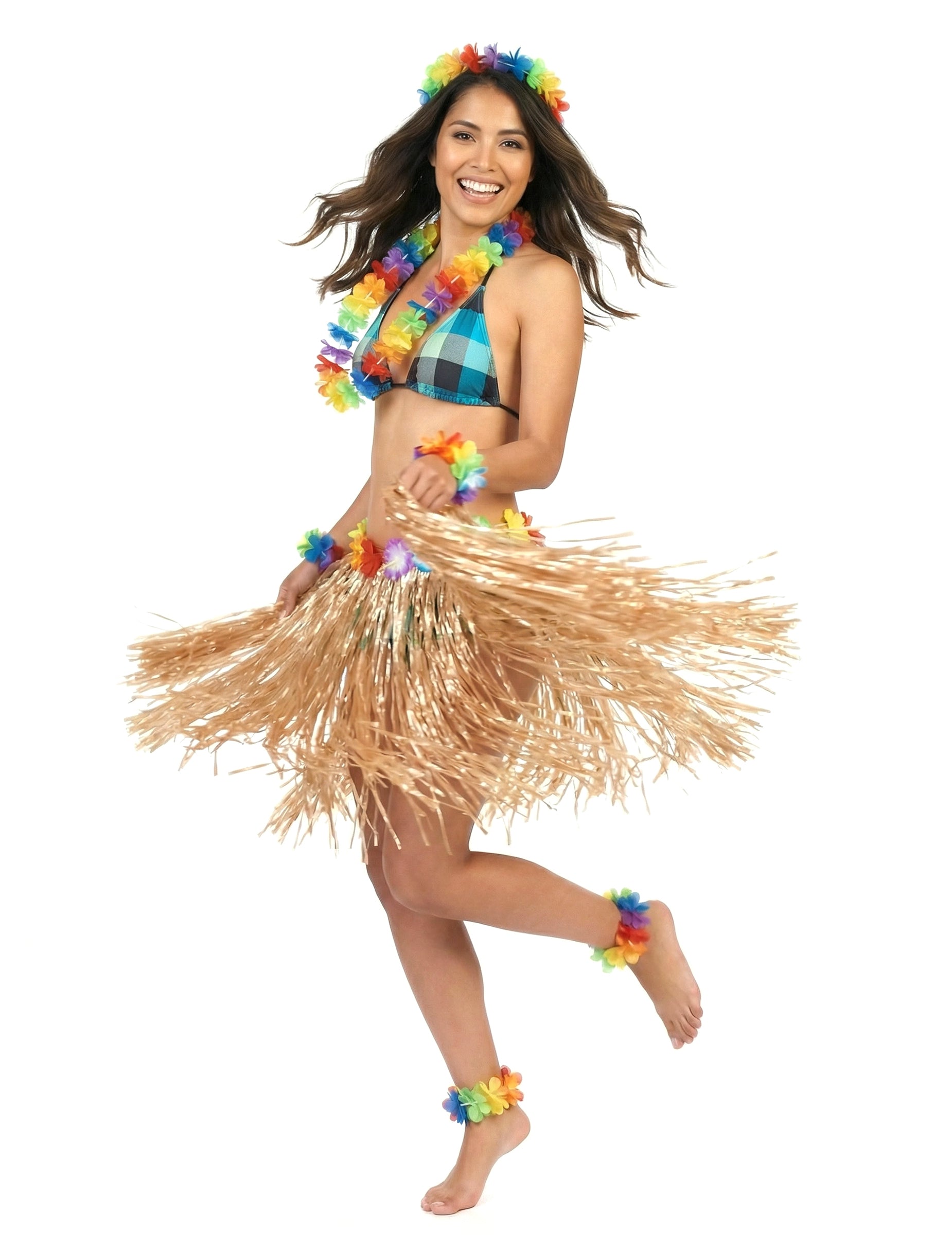 Тази маскировка е съставена от пластмасова пола за жени. Тази ресничка е еластична в кръста. Многоцветните хавайски цветя също са пришити по размер. Ресни в бежови тонове дават ефект на рафия на тази пола с размери около 45 см дължина. За една вечер по темата за Хаваите или на плажа, носете тази пола с върха на бикини Vahiné!