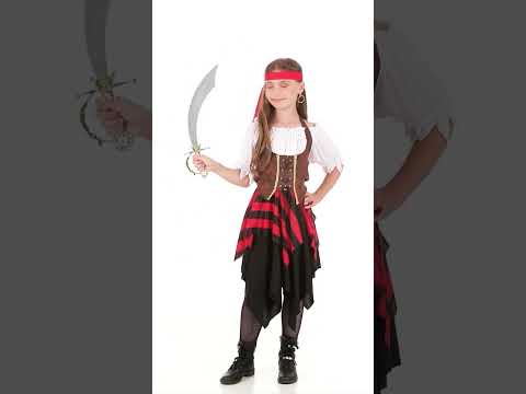 Този пиратски костюм за момичета се състои от рокля, корсет и лента за глава (меч, чорапогащи и обувки не са включени). Горната част на роклята е бяла, с еластично право деколте. Освен това има къси ръкави, нарязани на точки. Дъното на роклята е черно, с черна и червена раирана фуста над него. За допълнителен комфорт талията на роклята е еластична. Корсетът се носи като без гръб. Той е черен и еластичен на гърба и кафяв ефект на кожата отпред. Той има регулируемо черно облицоване в центъра на предната част. Тъмночервената лента за глава лесно ще се върже около главата. Този пиратски костюм ще бъде идеален за това да стане капитан по време на фантазия рокля като карнавал.