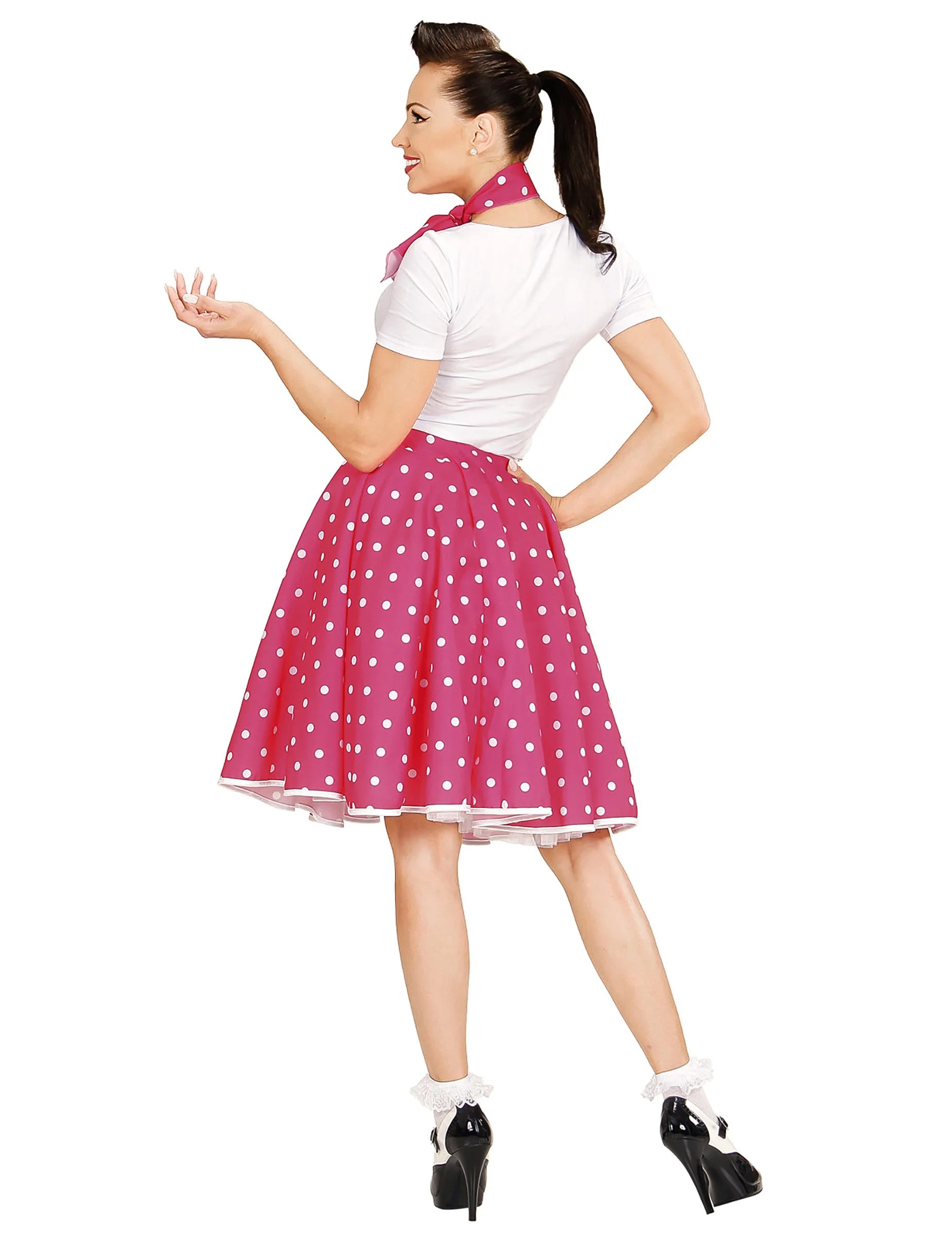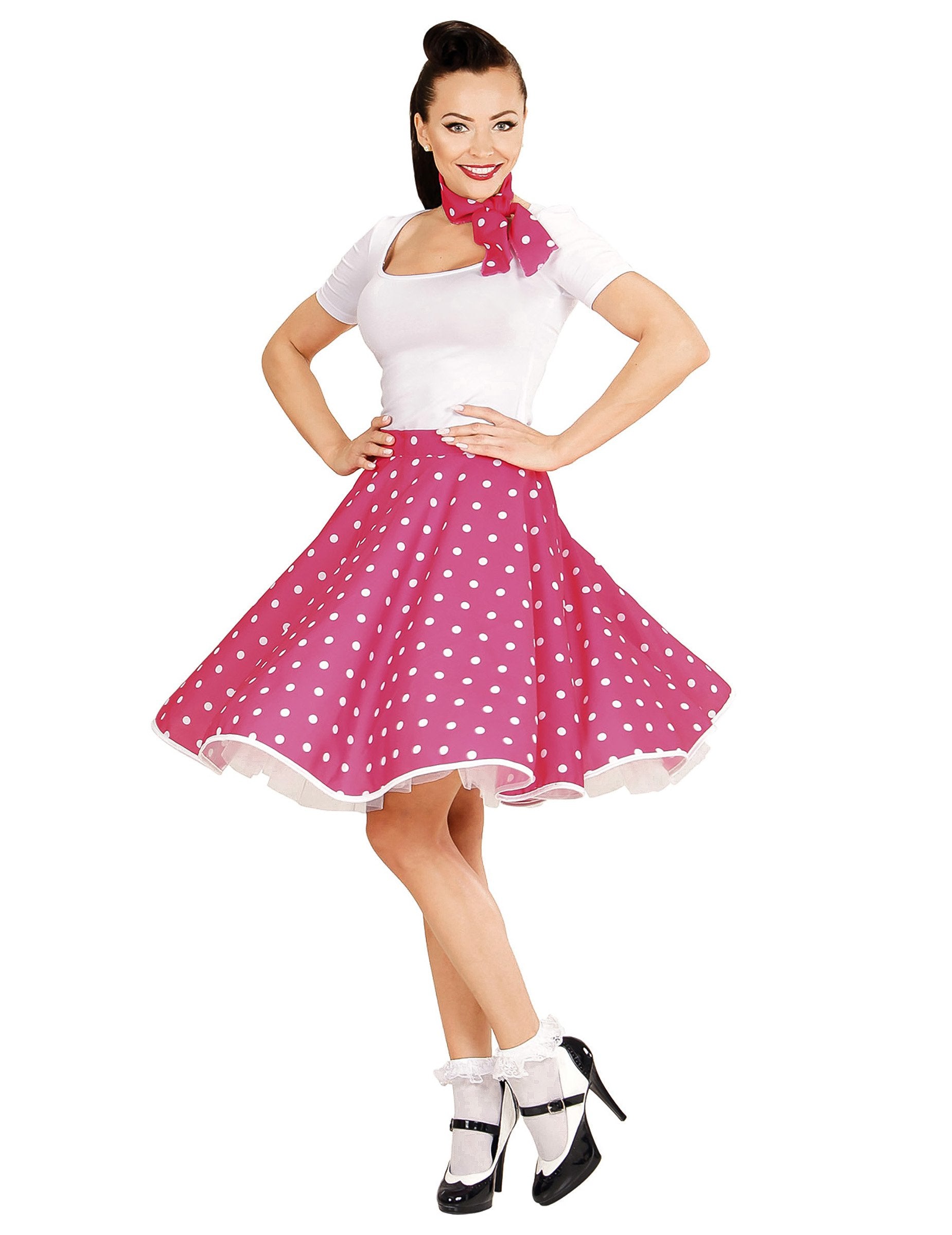 Тази маскировка включва пола и шал. Разплакваната и розова пола за рязане с бели точки. Той е със средна дължина и има еластичен размер, така че да можете да регулирате това облекло към вашата морфология. Шалът, изрязан в същата материя като полата, трябва да се върже около врата ви и перфектно ще аксесоари за това облекло. Не забравяйте да имате ефект на рок при по случай ретро вечер с приятелите си!