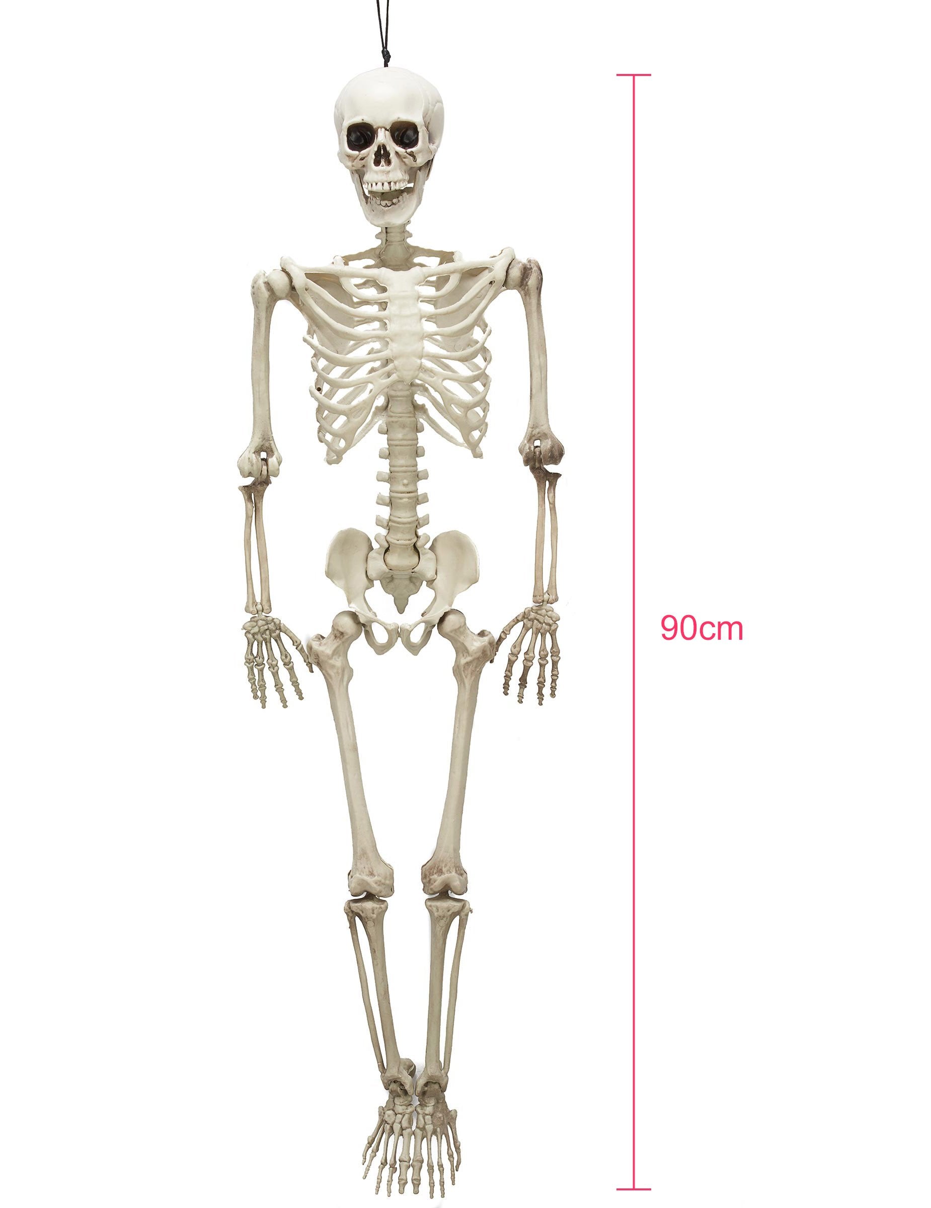 Този висящ скелет е пластмасов. Той е с височина приблизително 90 см. Членовете на скелета са артикулирани, така че да можете да го модулирате по ваше удобство. Връзката присъства на черепа на скелета, за да го спре лесно. Тази скелетна декорация ще бъде идеална за завършване на декорацията на вашата стая по случай Хелоуин.