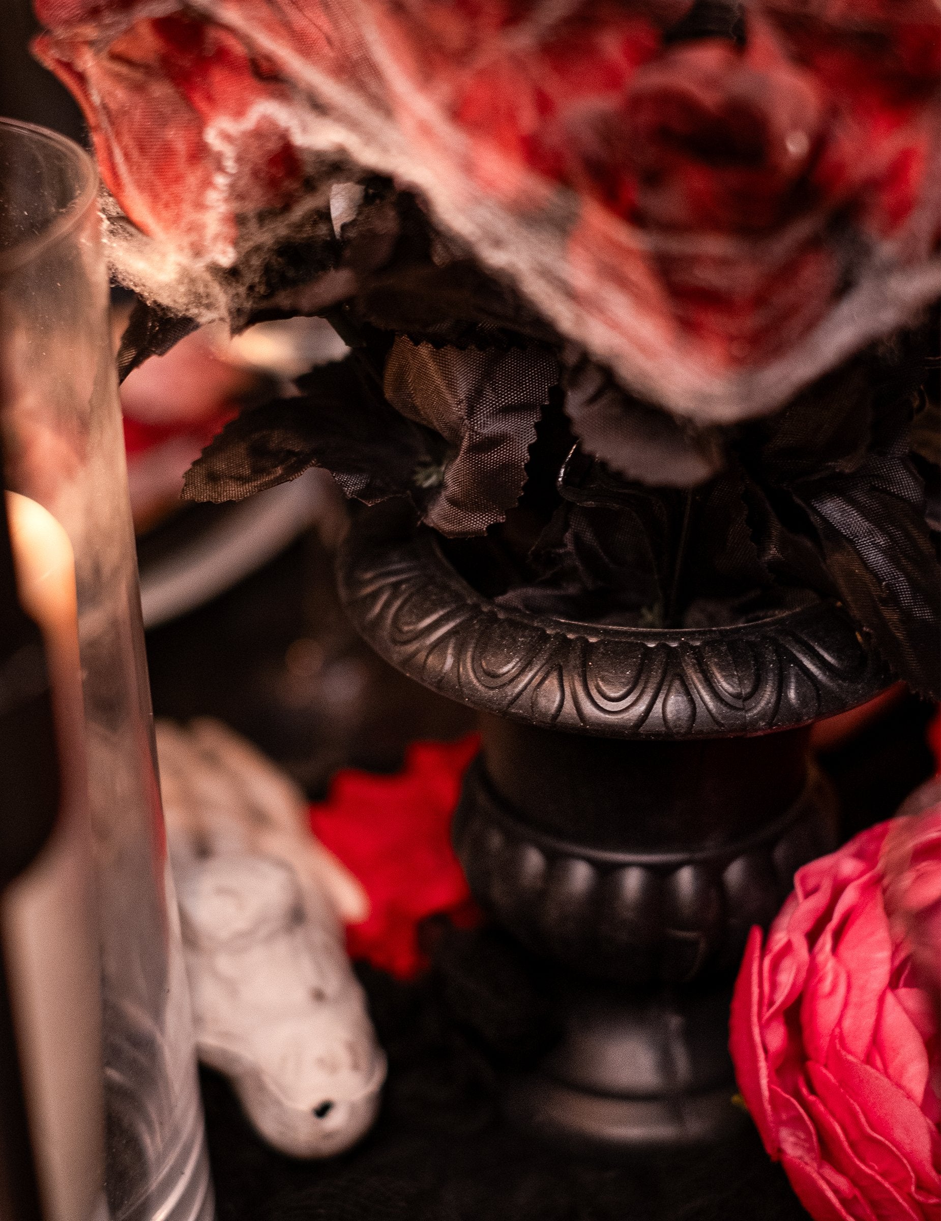 Тази декорация представлява пластмасова ваза, пълна с рози с червена тъкан. За призрачен ефект розите са покрити с фалшиви паяци. Този букет е висок приблизително 35 см. Тази украса ще бъде идеална за масата на вашата вечер на Хелоуин! Copyright Widmann Srl