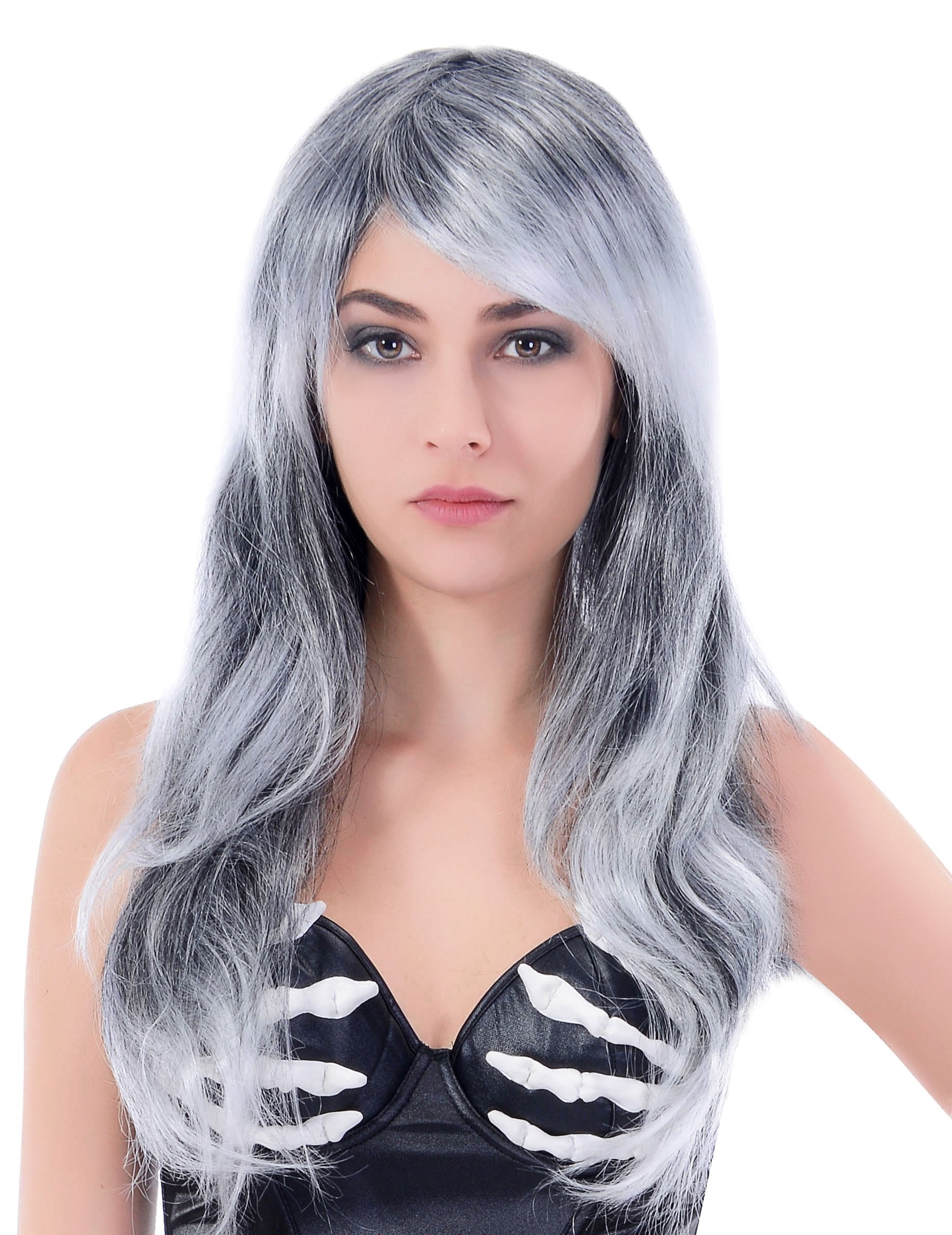 Тази перука за жени има дълга вълнообразна синтетична коса. Той е сив на цвят с линия отстрани. Тази перука е идеална за завършване на вашия тоалет по време на темата ви или вечерната вечер с зомби.