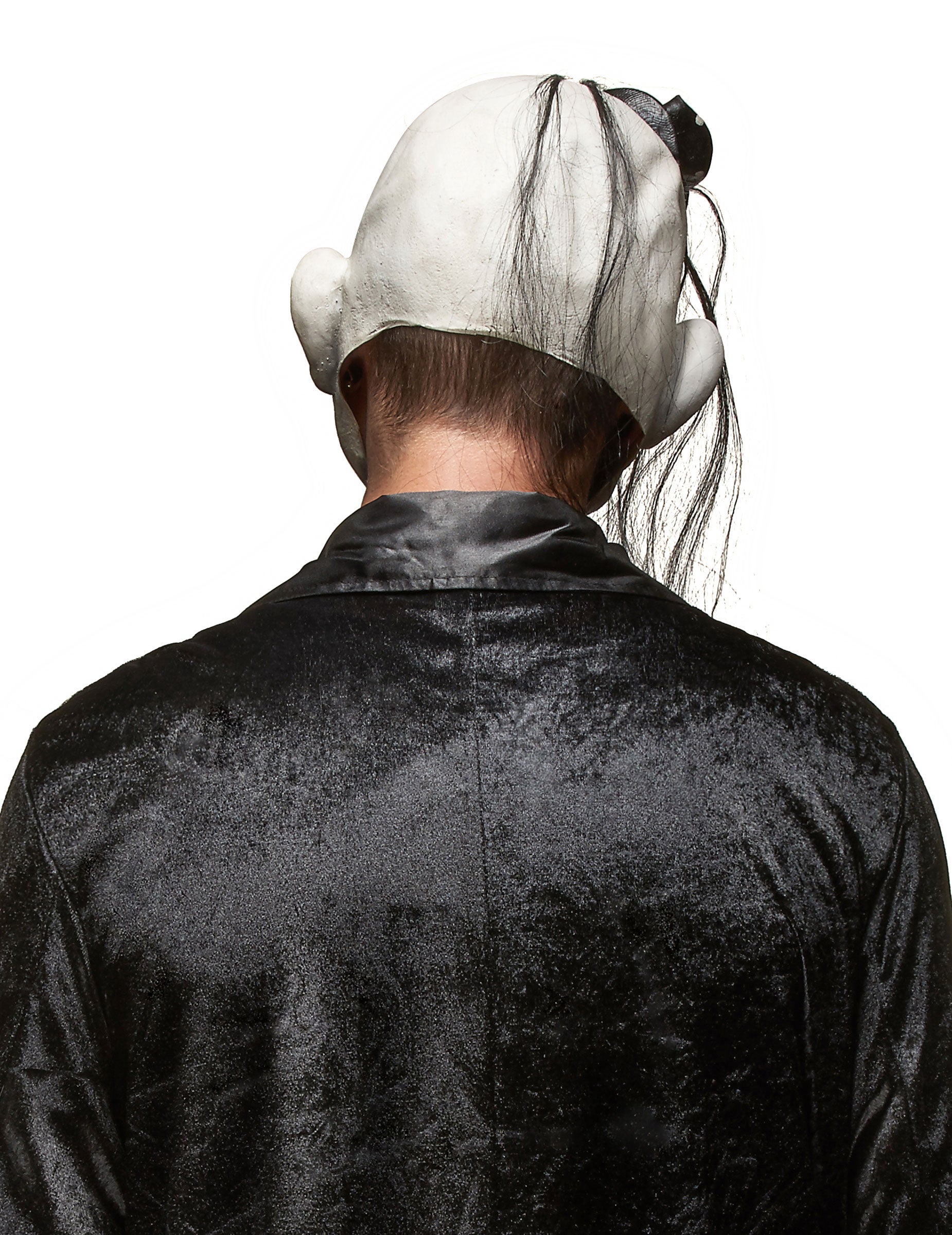 Тази латексна рокерска маска е за възрастни. Той ще покрие 3/4 от главата ви. Отгоре са включени черна шапка с бели точки и кичури коса. За да се даде страшна страна на маската, на челото е разположен червен белег от около 10 см. Усмивката му дава настинка отзад. Този аксесоар ще бъде перфектно декориращ прикриването и треперещите минувачи -от вечерта на Хелоуин. NB: Тази маска съдържа латекс и може да причини алергии при хора с латекс.