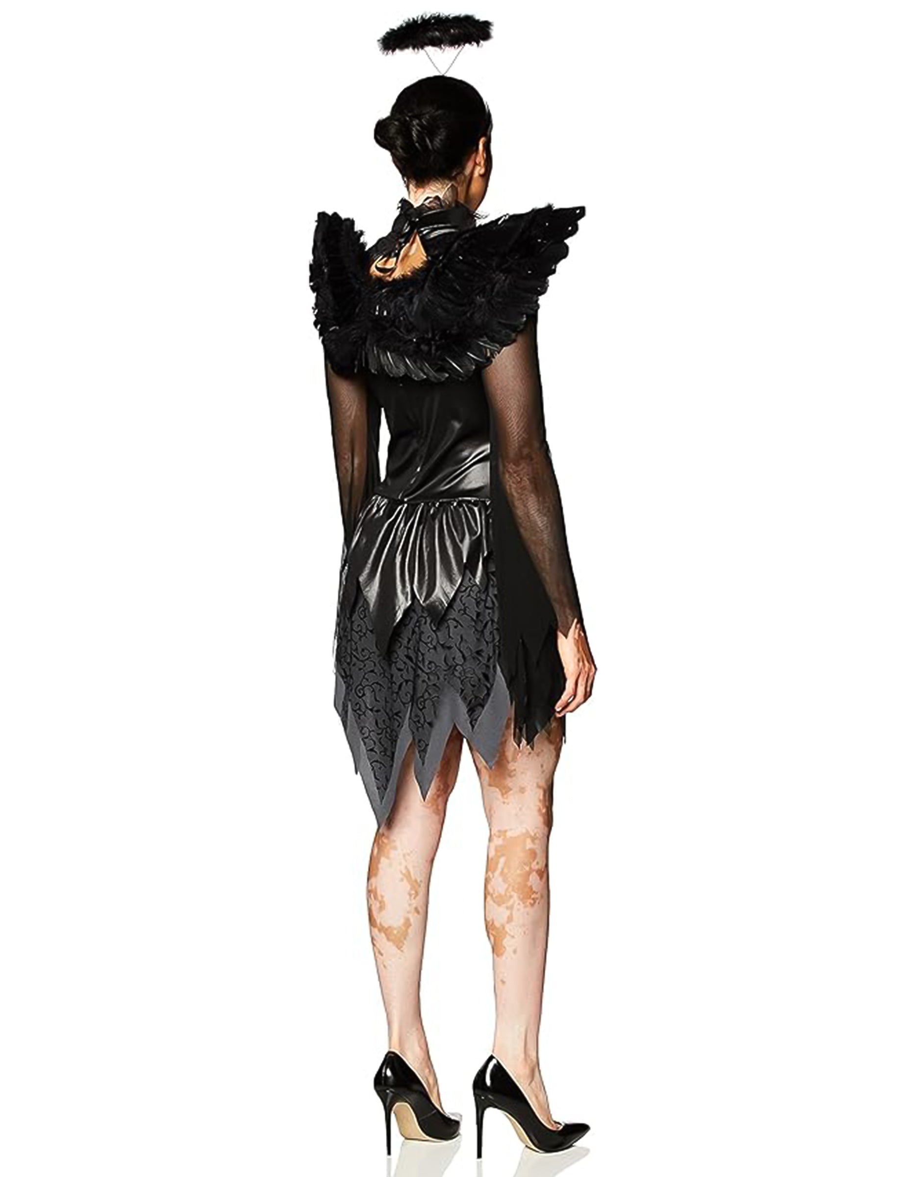 Този паднал ангелски костюм за жени се състои от рокля, лента за глава и чифт крила. Черната рокля е къса. Сервира се в краищата, а широките ръкави са изработени от черна риба. Той е еластичен, а в гърдите и шията присъства елек със сатенена панделка. Дървените ленти от тъкан от резервоара с барокови шарки присъстват върху цялата дреха, а цип отзад ще улесни използването му. Крилата са около 38 см. Те са направени от твърди пера и две еластики ще улеснят подкрепата им на раменете ви. И накрая, лентата за глава, преодоляна от ореол от черни пера, идва да аксесоари този комплект. Този костюм ще бъде идеален за превръщането ви в паднал ангел в Хелоуин вечер.