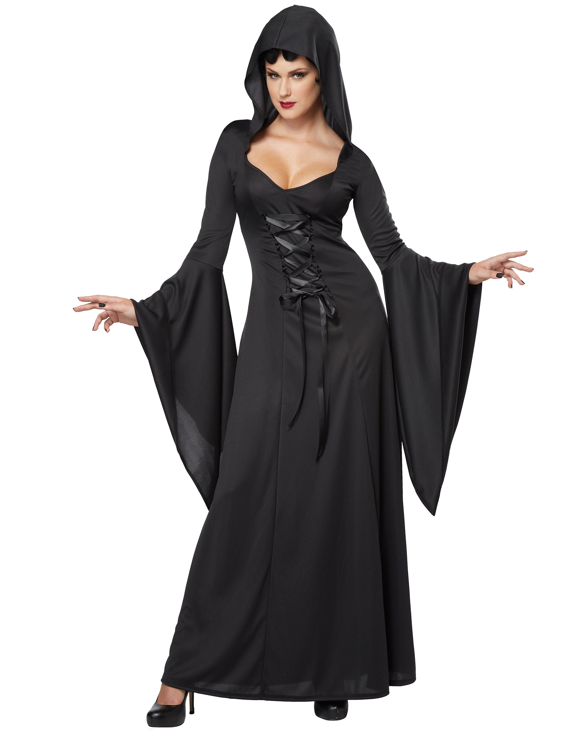 Този черен костюм на вещиците за жени се състои от дълга рокля (обувките не са включени). Роклята има дълги разпалени ръкави. В предната част на роклята присъства черна галета и ще ви позволи да коригирате роклята към вашата морфология. Тази рокля също има качулка. Тази рокля на готическата графиня ще бъде идеална за разкриване на вашата тъмна страна на Хелоуин вечер.