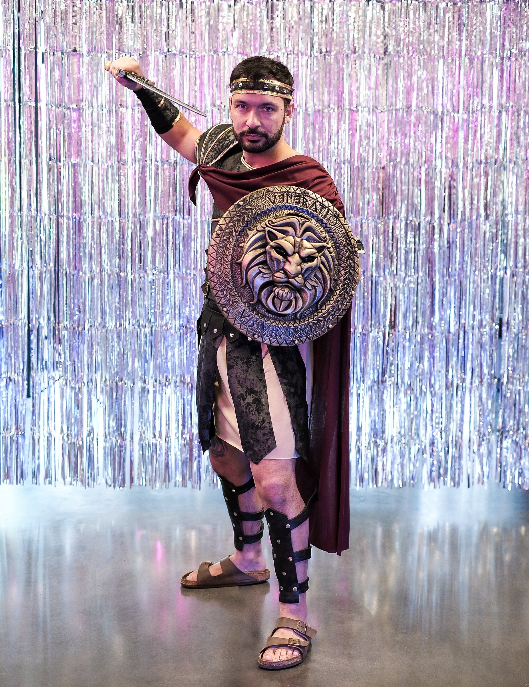 Този мъжки гладиаторски костюм е съставен от туника, броня с интегриран нос, ленти и маншети, банер, а-трибален защитник, рамо и медальон. Късото туника с понижаване е проста, лека, счупена бяла на цвят и пристига на коленете. Бронята на велурния допир зарежда бюста и притиска размера, използвайки две панделки, за да се върже в гърба. Също така, четири дебели ресни се избягват и украсяват дъното на туниката. Кейп, интегриран в бронята, е бургундски червен, поставен е отзад и напълно покрива тоалета. Вдясно рамото се фиксира благодарение на драскотините, докато е вляво, нос завеси и обгръща част от бронята. Пин медальон позволява драперията да бъде прикрепена към рамото. Златните свързващи вещества украсяват цялата маскировка, също и аксесоарите: лентите за ръка и тибиите, защитаващи се с драскотини, докато маншетите се плъзгат по китките. Накрая лентата за глава се поставя на челото и се фиксира с помощта на еластична. Присъединете се към редовете на Цезар и бъдете най -харизматичните от спартанците до вашите вечери по темата на римляните и гладиаторите!