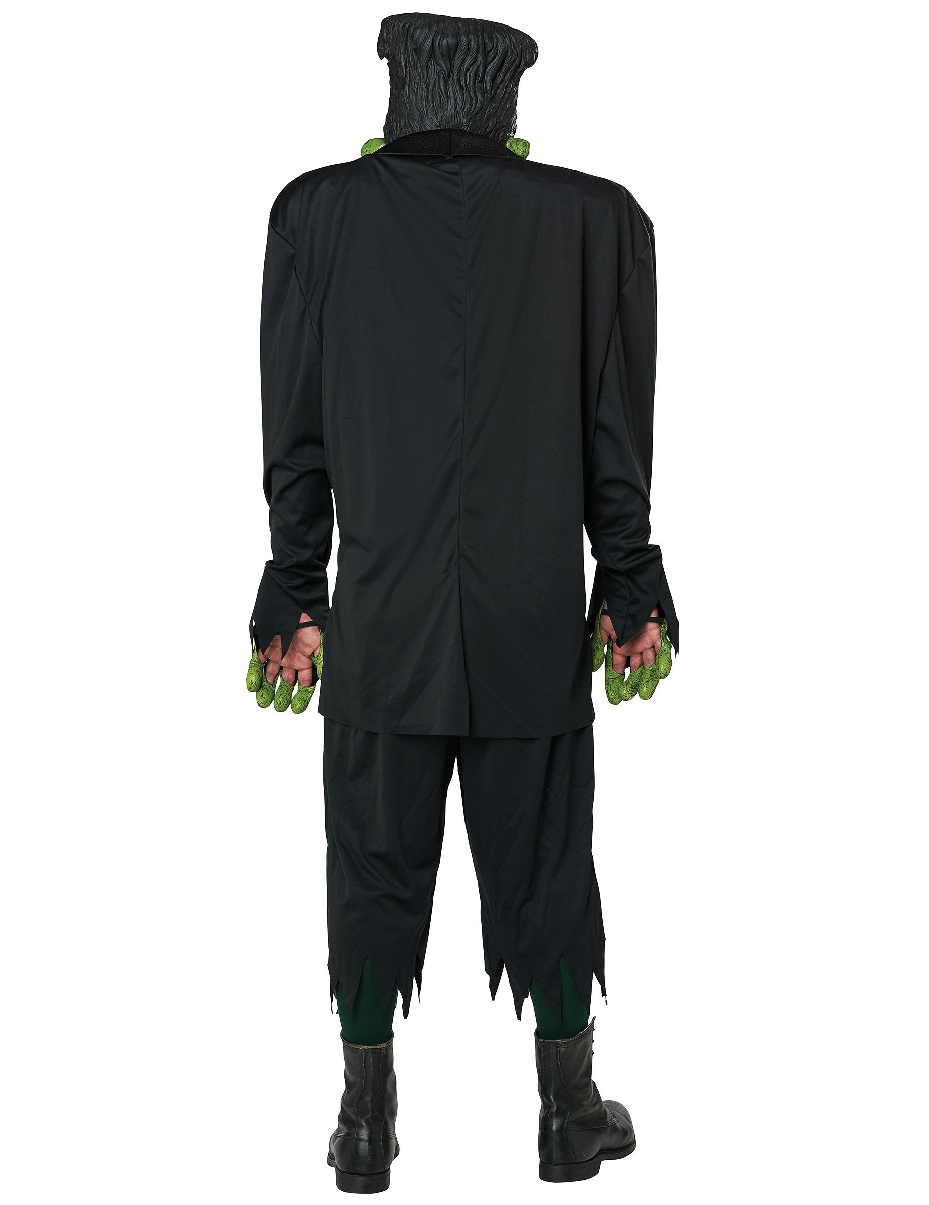 Този възрастен костюм на Франкенщайн се състои от високи, панталони, чифт ръкавици, маска, чорапи и надуваеми рамене (обувки и микро, които не са включени). Върхът придава илюзията за костюм яке. Той е черно и бяло посегателство, представляващо риза с папийонка, присъства в гърдите. Ръкавите са дълги и назъбени в краищата, а яката е направена от пяна. Фалшивите бутони също се пришиват в предната част на дрехата. И накрая, надуваемите рамене, много лесни за използване, ще донесат подпухнал ефект в тоалета. Черните панталони са еластични в кръста за максимален комфорт. Той се сервира в краищата и ще пристигне на коленете. Включена е и пълна маска, представляваща главата на героя. Той е в гъвкав латекс и има много реалистични облицовки. Гъвкави латексни ръкавици и големи зелени чорапи ще дойдат за аксесоари за този комплект. Този костюм ще бъде идеален за тероризиране на вашия антураж в Хелоуин вечер.