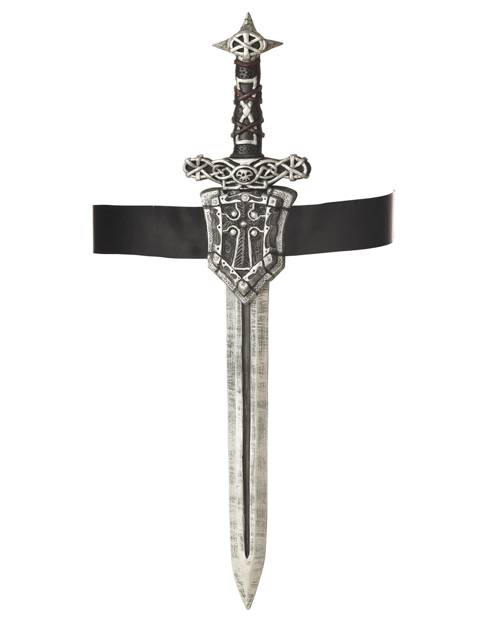 Този рицарски комплект е съставен, меч от сребърен пластмасов рицар и черен колан. Дръжката завършва в пика, а центърът на охраната представлява череп. В основата на острието е герб с религиозен кръст в средата. Острието е направо с жлеб в центъра, мечът е с размери 61 см. За да довърши костюма на рицар, този меч ще бъде идеален.