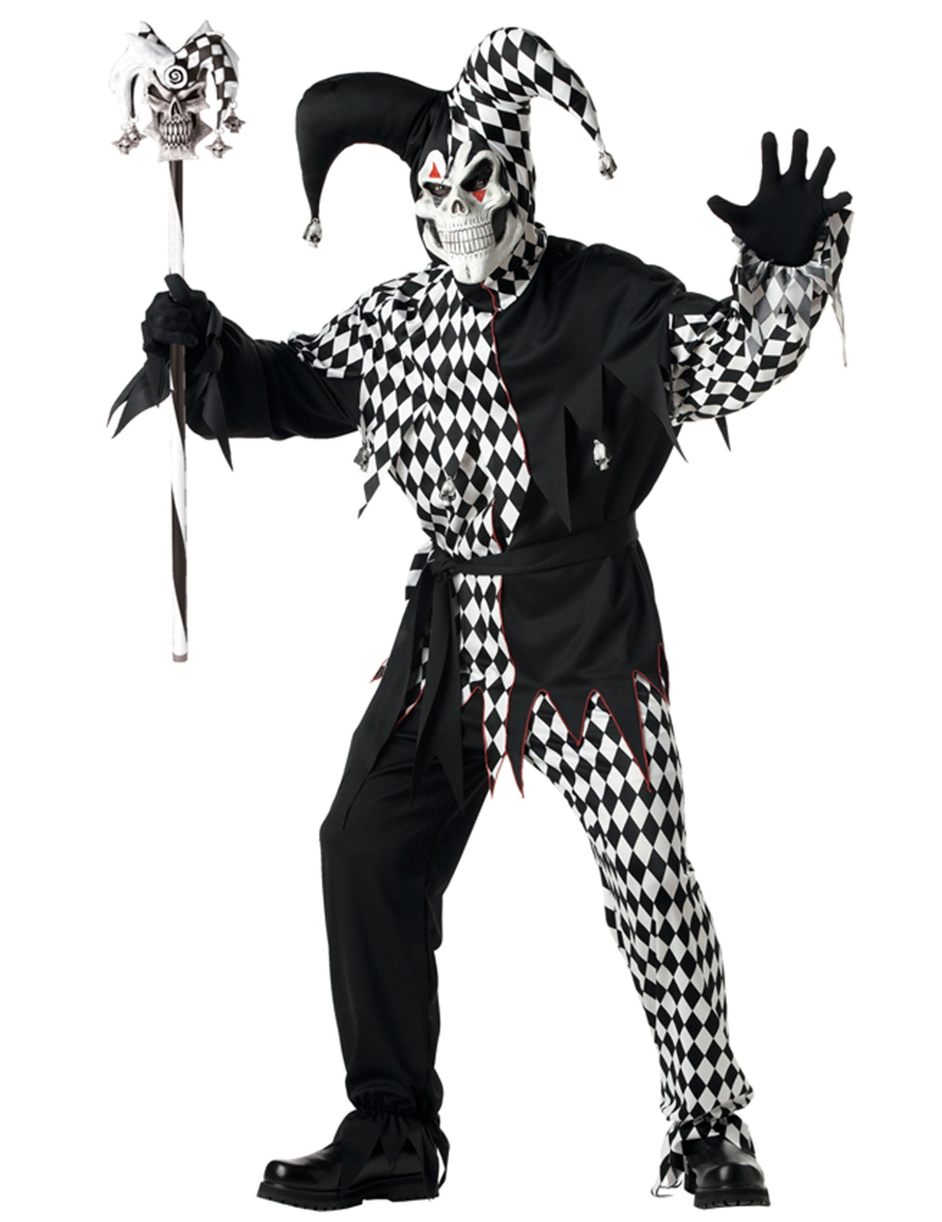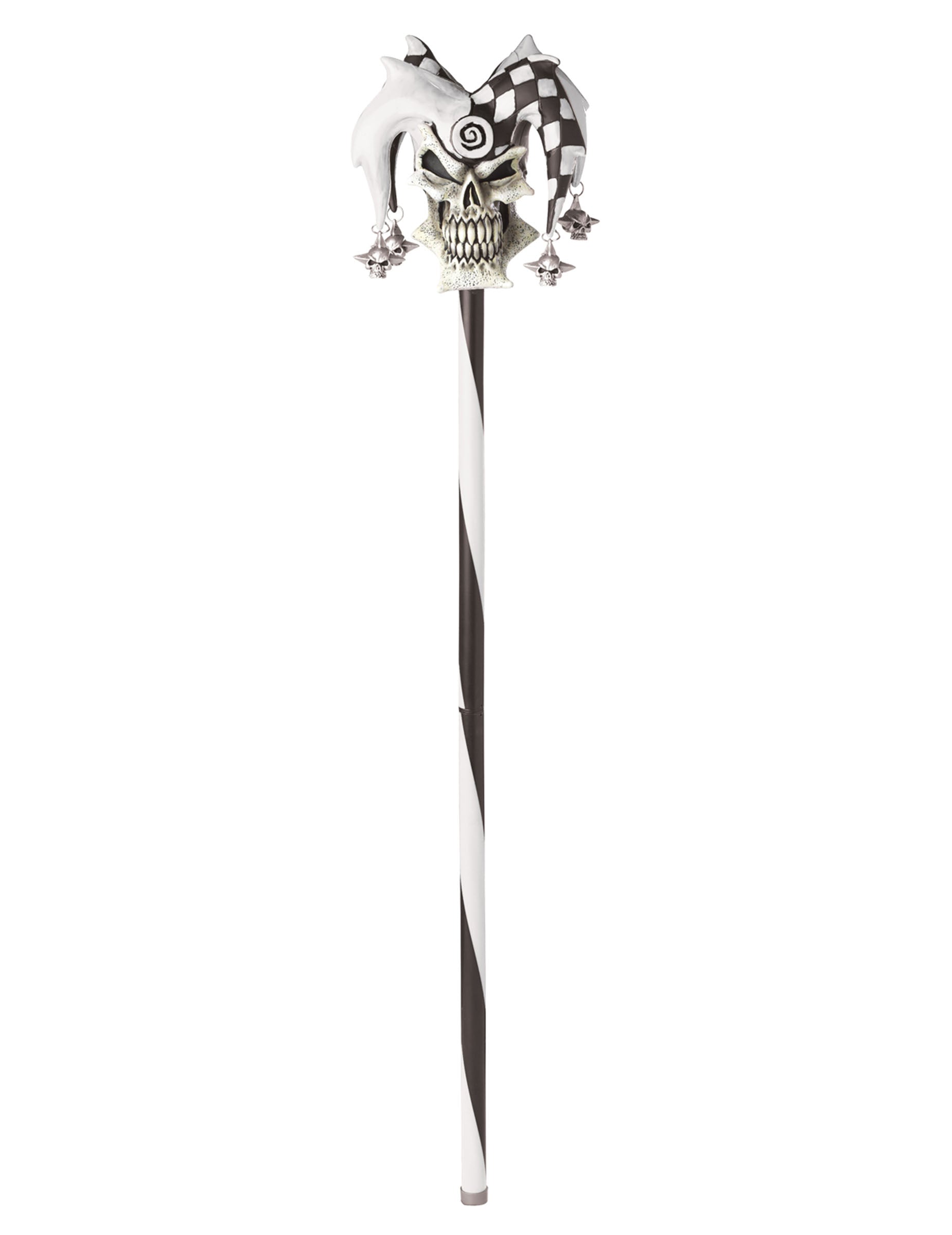 Тази бастуна бастун е с размери приблизително 101,6 cm. Дръжката е покрита с бяла лента и черна лента, която се уви около нея. Върхът на бастуна е череп с весела шапка, наполовина бяла, наполовина с кариран с кореми във формата на смърт на смъртта, завършена с шипове. Бастунът е в две части. Идеален за Хелоуин, този бастун ще започне всички съседи.