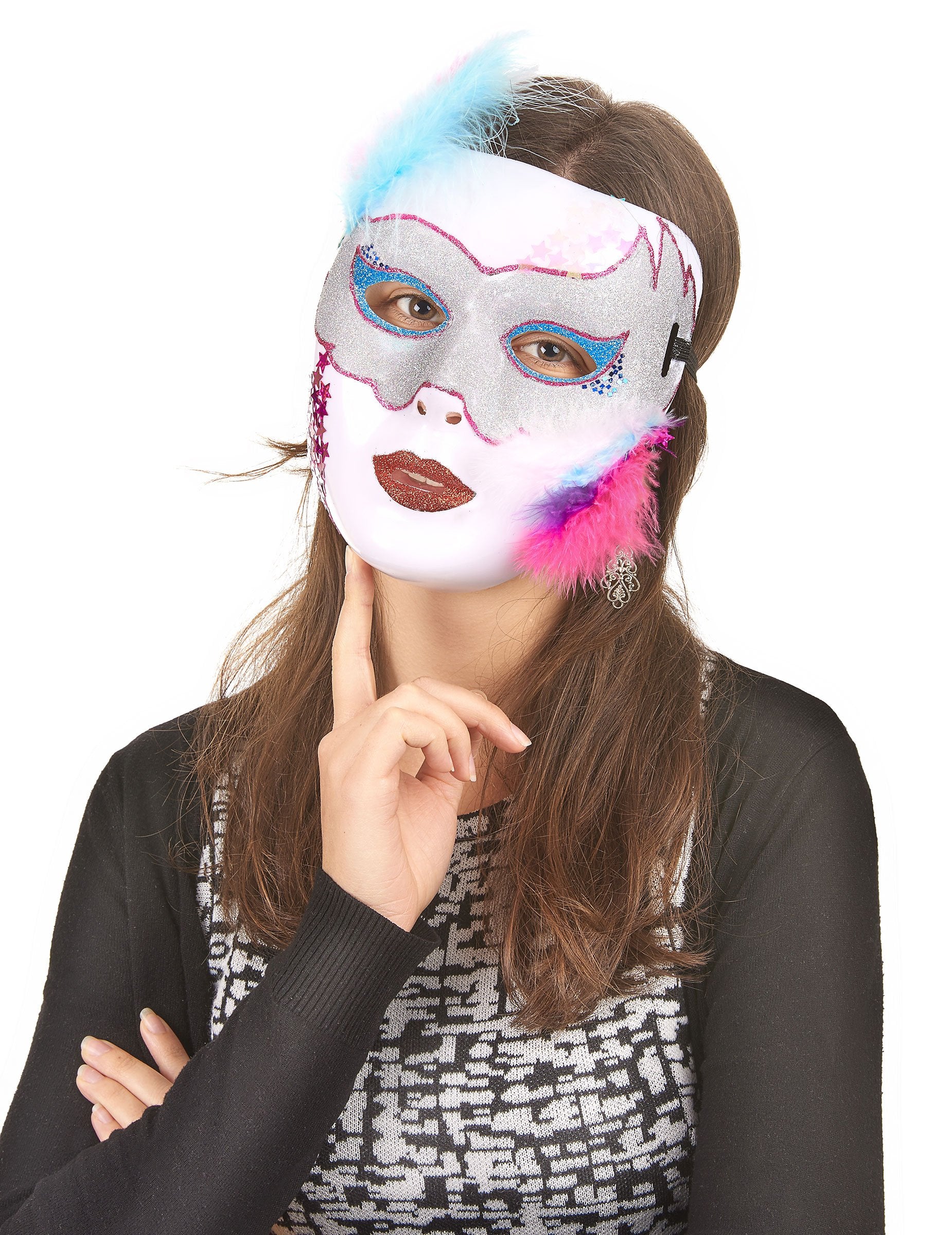 Това лъскаво бяло полумаске е направено от гъвкава пластмаса и ще се държи в лицето ви с еластична. Той ще бъде подходящ за лице за възрастни. Като предоставите безплатно въображение на въображението си, можете да безкрайвате този аксесоар безкрайно, за да създадете уникално парче! (С пера, блясък, пайети ... и т.н.) За прикрита вечер прекарайте инкогнито с приятелите си! Снимка N2 е предложение за презентация.