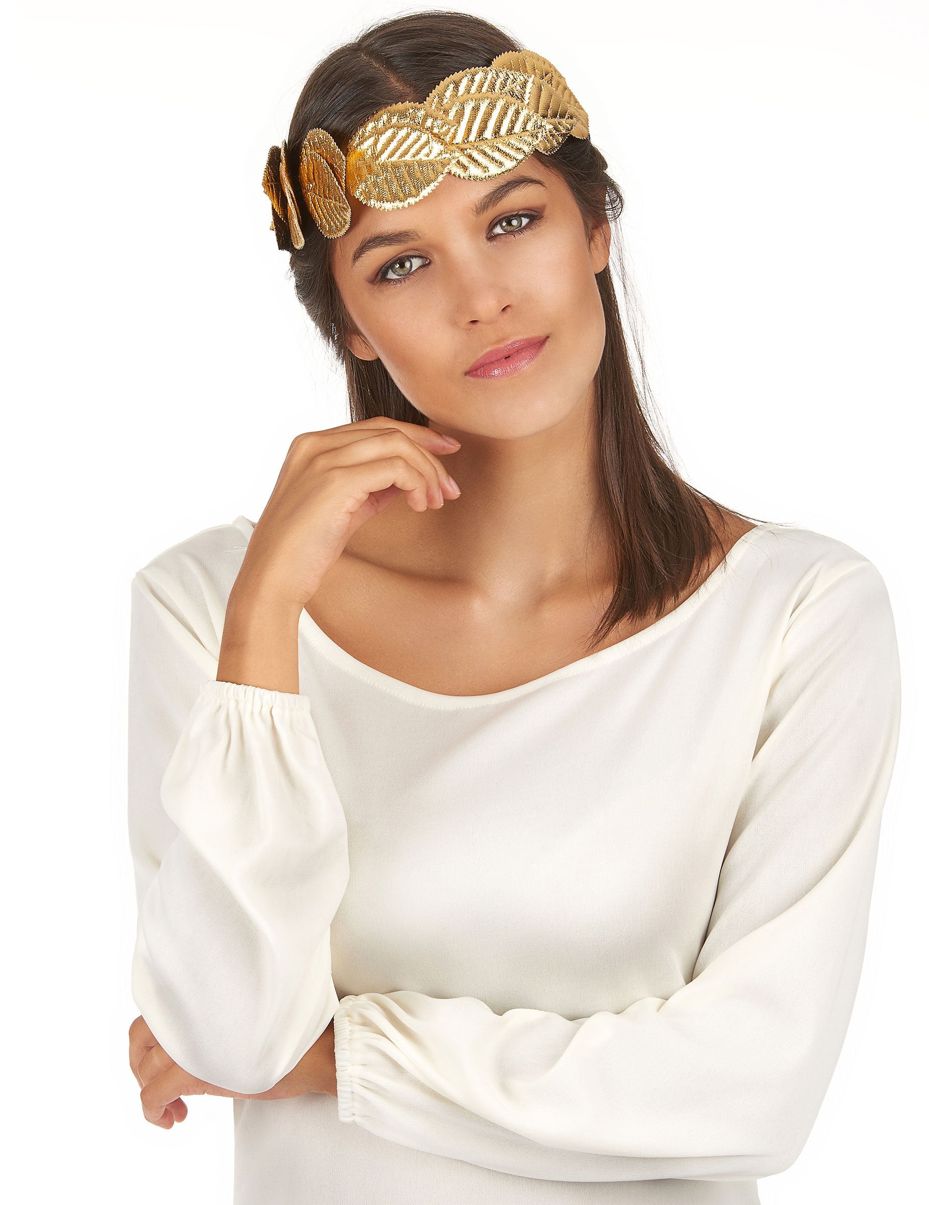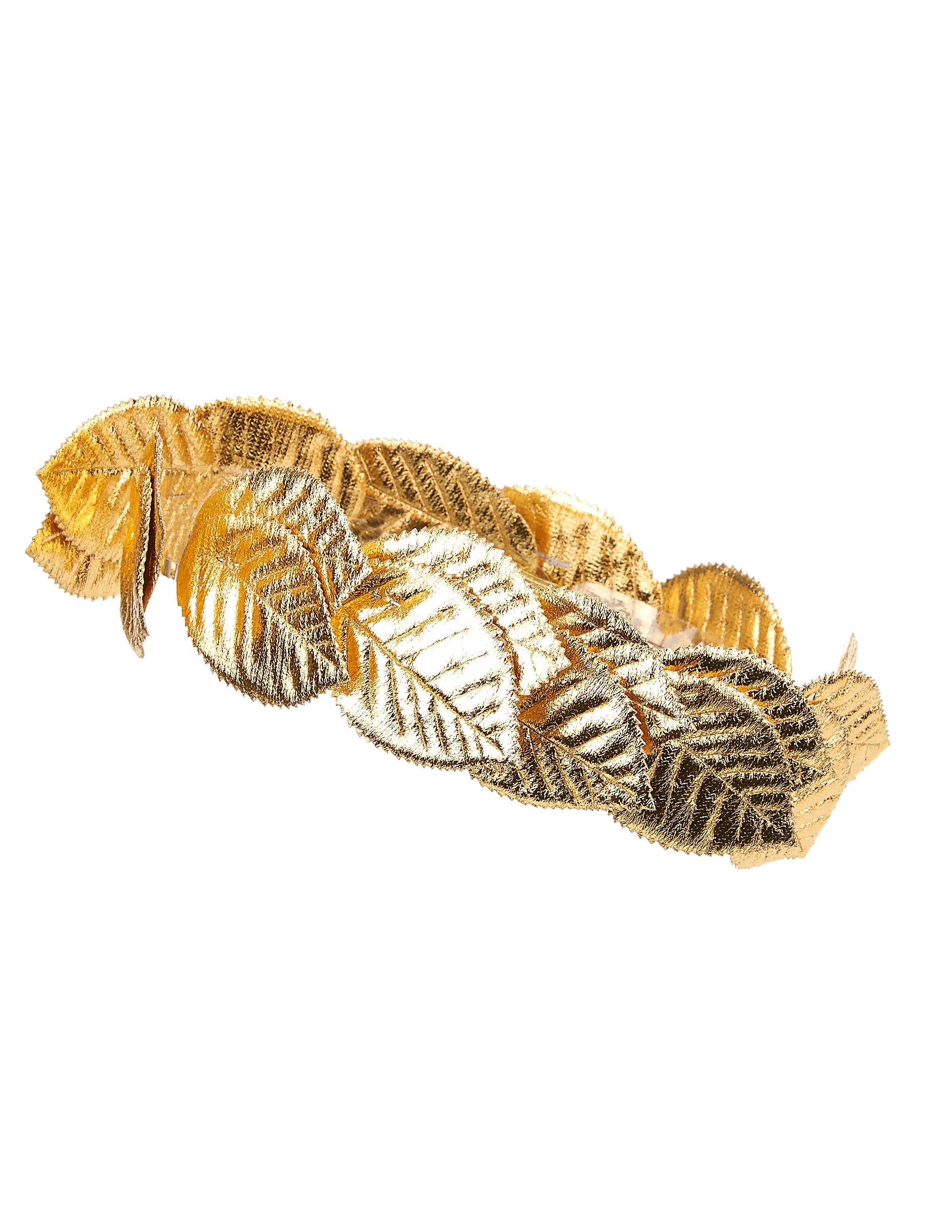Този венец за възрастни лаврии се състои от листа от златни заливи в плат. Те са фиксирани върху лента от прозрачна пластмаса. Малка еластична ще ви позволи лесно да адаптирате тази залива на завоя. Тази залива корона ще бъде идеална за завършване на вашето облекло на римския император по време на вечерната вечер.