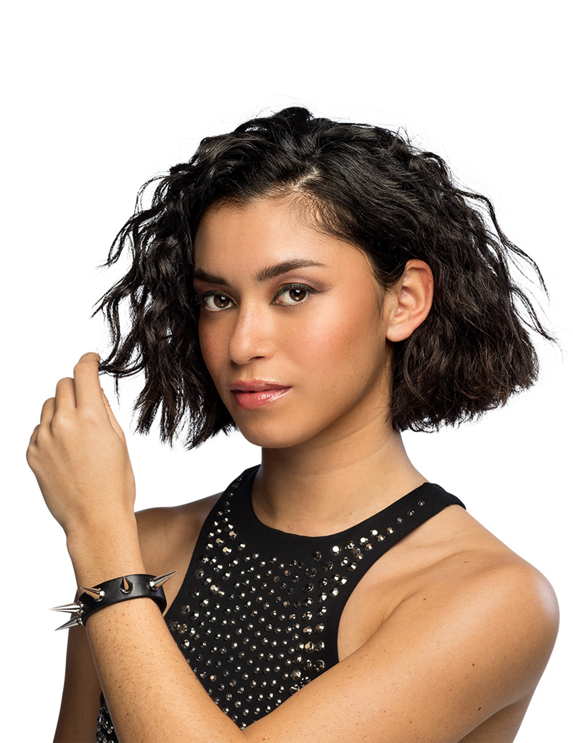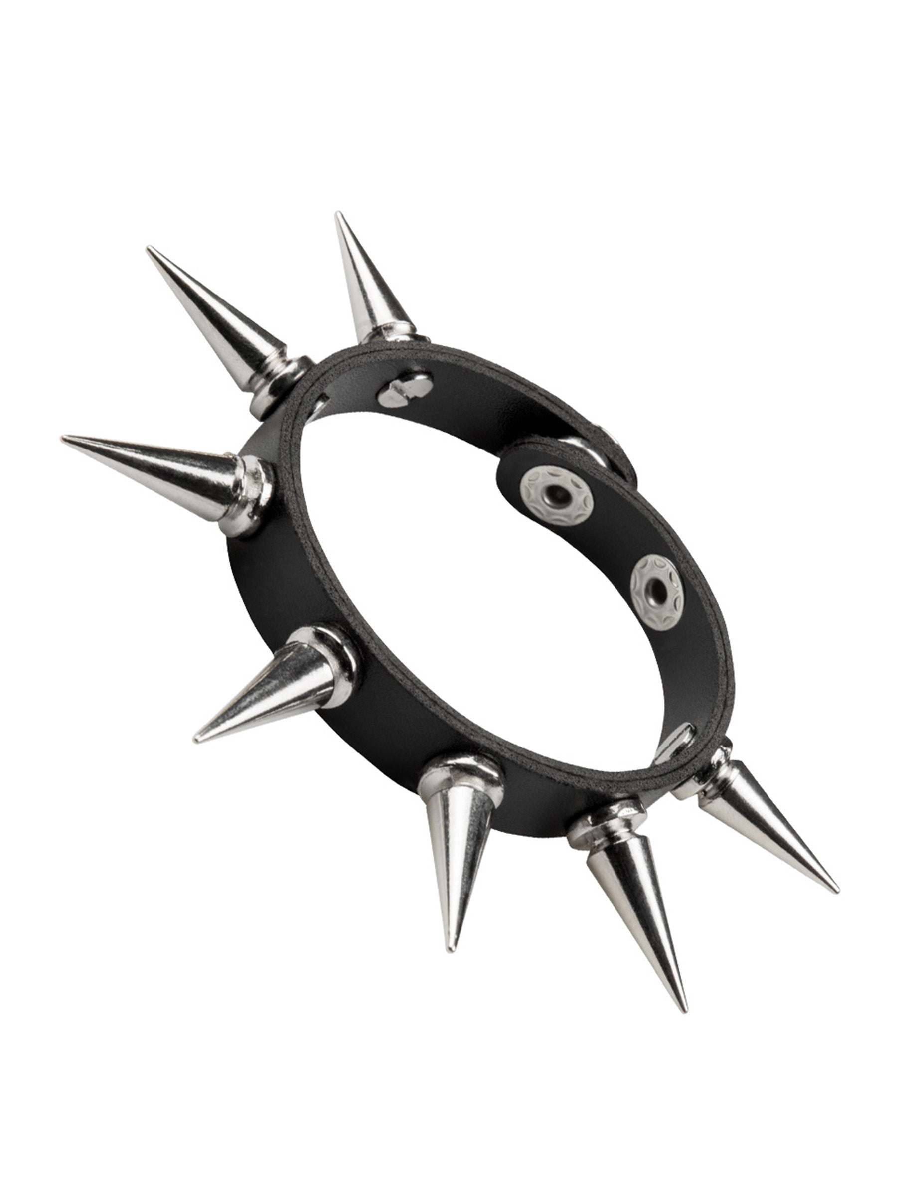 Тази пънк гривна за възрастни наистина е черна кожа. Той е декориран с дълги сребърни метални върхове. Тази гривна се затваря с бутон за натискане и може да се регулира на 2 нива, за да се адаптира лесно към китката ви. Този аксесоар ще бъде идеален за завършване на пънк костюм за карнавала.