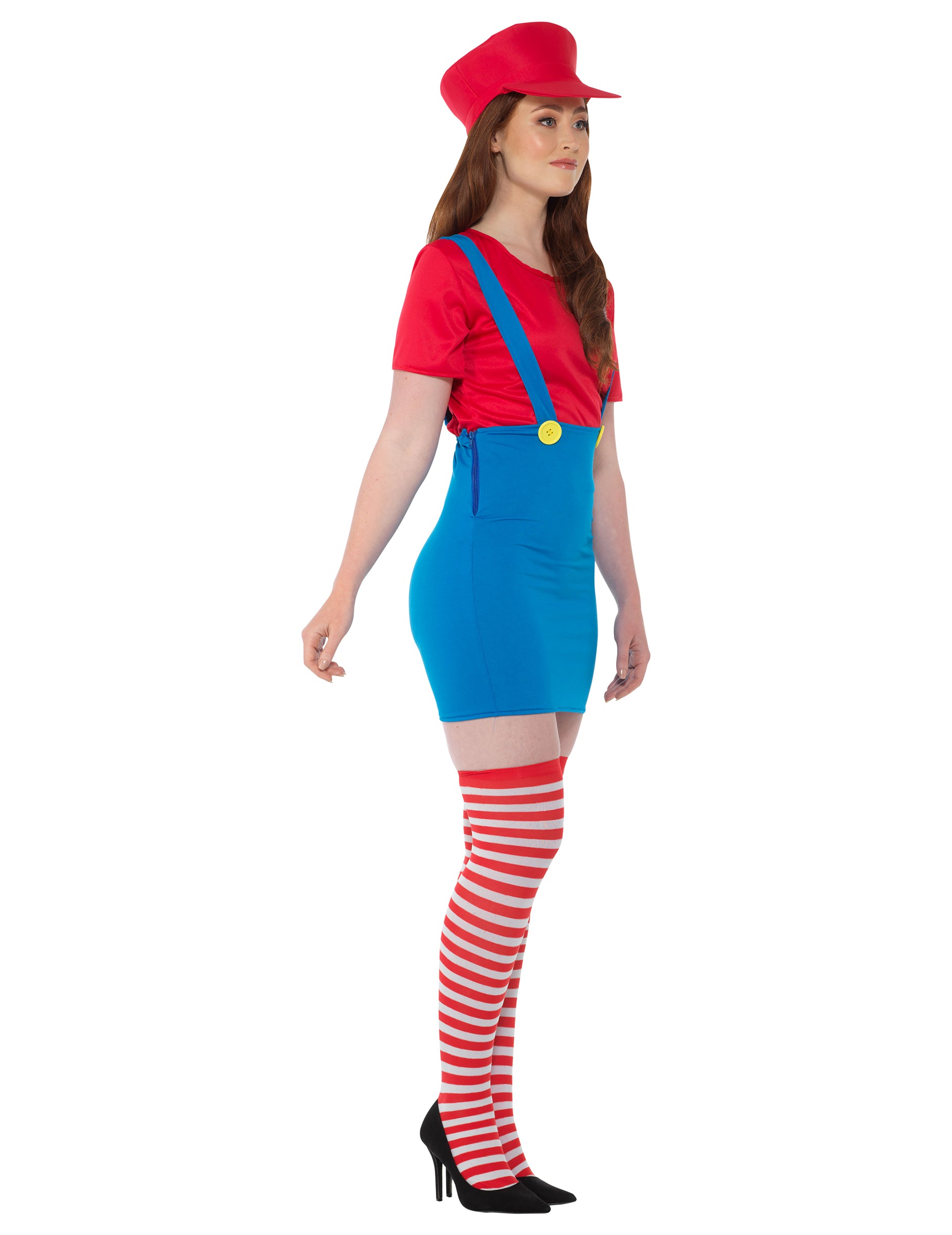 Този костюм на червен водопроводчик за жени се състои от пола, t -риза и шапка и чорапи. Високата пола е синя с 2 суспендатори. Той е декориран с жълти бутони в основата на окачвателите. Тениската с къс ръкав е червена. Съответстващата капачка е със същия цвят. Белите и червените камъни украсяват прикриването. Този костюм на червения водопроводчик ще бъде идеален да ви отведе за героиня от видеоигри по повод карнавала.