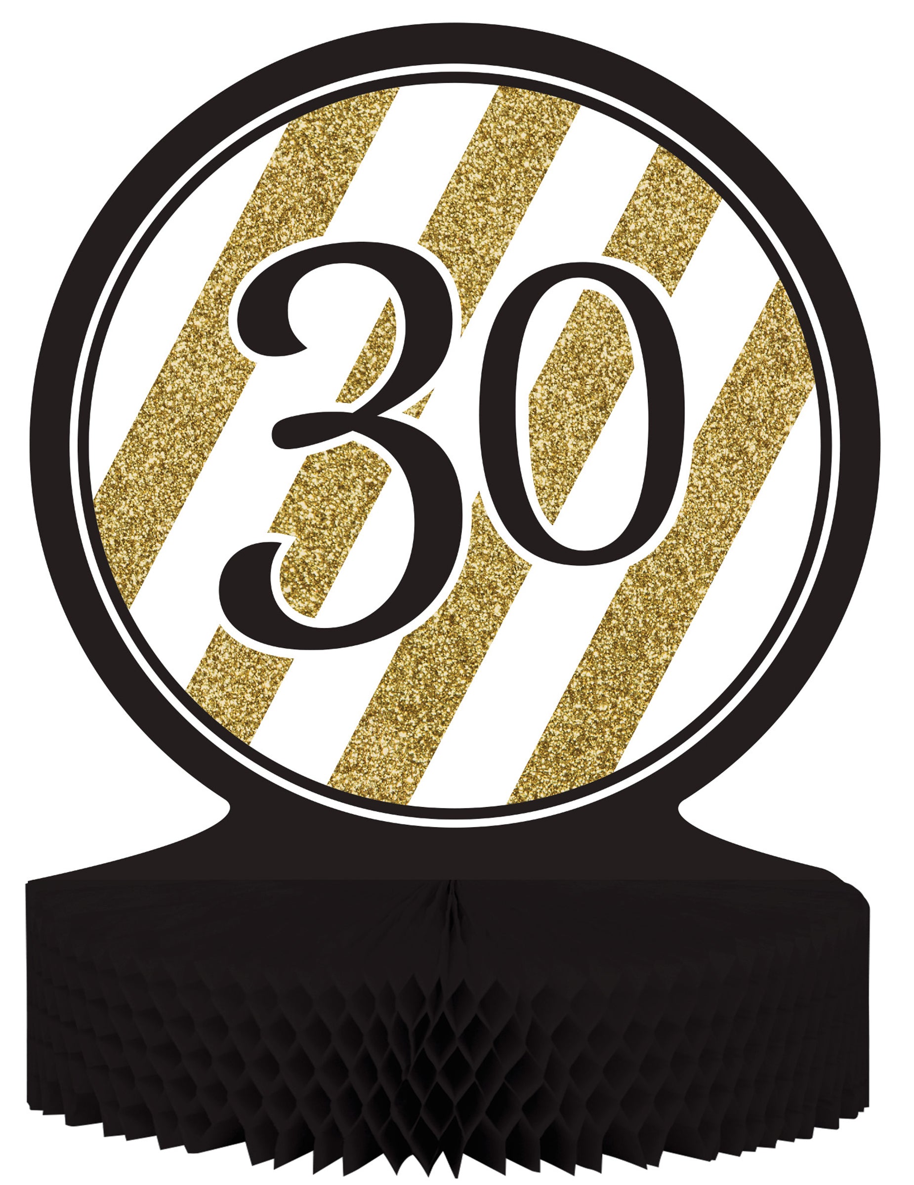 Този център за масата за рожден ден е изработен от картон. Той е съставен от картонен диск с диаметър приблизително 23 см и опора на черна набита хартия, разгъваема 30 см в диаметър. На диска с черни ръбове фигурата "30" е отпечатана с отпред / отзад в центъра и се украсява със златни ленти. След като се разгърне, хартията с пчелна пита ще се държи благодарение на малък лепилен лепилен пластир. Този централен елемент ще бъде перфектен в средата на шикозна и златиста декорация на 30 -ти от любим човек!