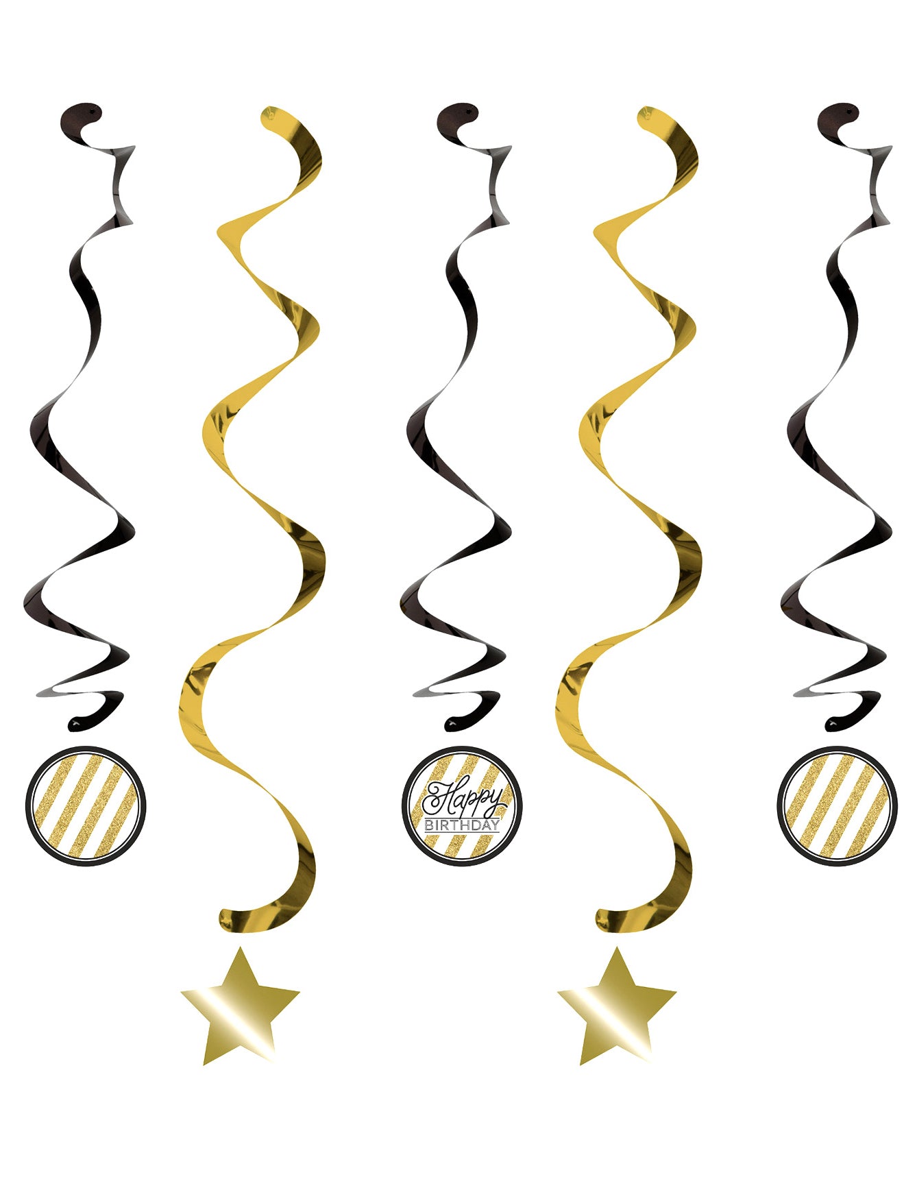 Тази партида включва 5 спирални суспензии. Всяко окачване е съставено от спирала от черен или златен цвят в края на която дискът или звездата са окачени. Звездата е златна. Що се отнася до диска, той има бели ивици и ефект на блясък, както и черен ръб със или без надписа "Честит рожден ден". Дисковете за стикери с фигура като "18" или отпечатък от тортата са включени за персонализиране на вашите окачвания. Тези суспензии ще бъдат идеални за декориране на вашия интериор на рождения ви ден!
