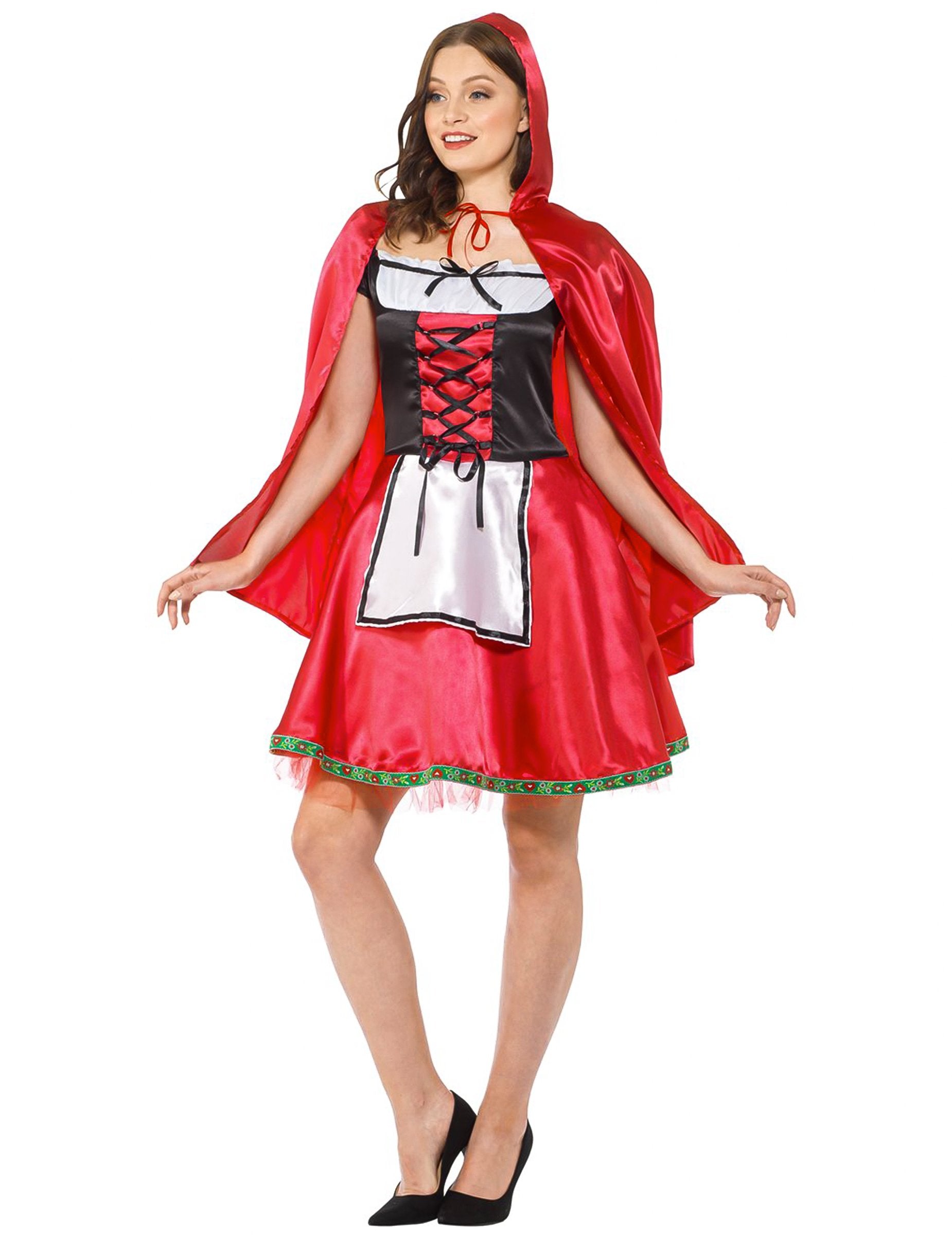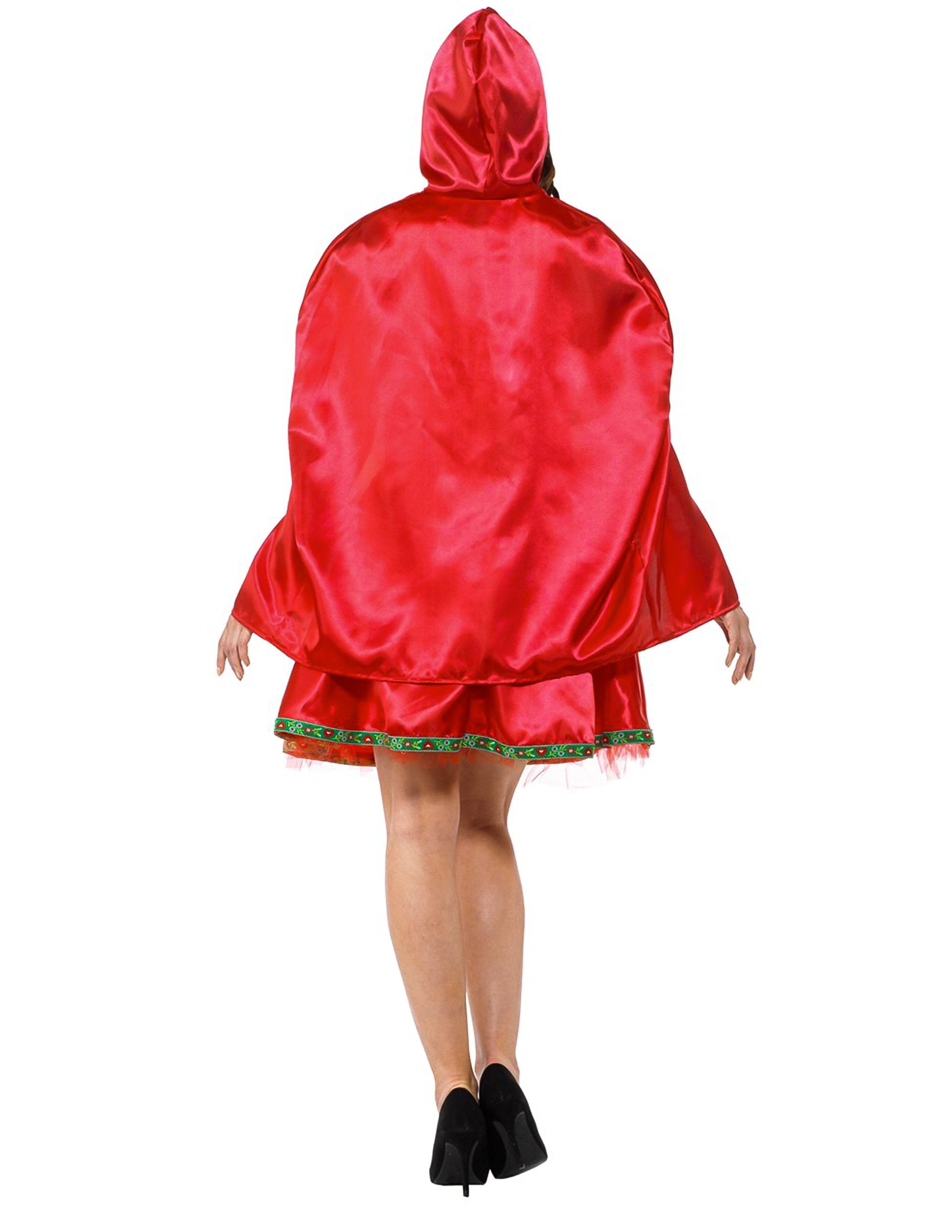 Този червен костюм на шаперона за жени се състои от рокля и нос (кошница, обувки и чорапи не са включени). Роклята, нарязана на сатенена материя, има къси подпухнали ръкави, украсени с червен сатен възел. На гърба присъства цип. Белият и черен връх има корсет, който можете да коригирате към размера си. Червеното дъно има бяла и черна престилка. Червеният тюл се пришива отвътре за лек ефект на обема. Граница в зелена тъкан от печат носи нотка на фантазия на тази сладка малка рокля с качулка с червена езда. Сатенният червен нос с качулка ще завърши перфектно тоалета. Играйте сладка малка качулка за езда по случай вечер, прикрита с приятели или тематична вечер!