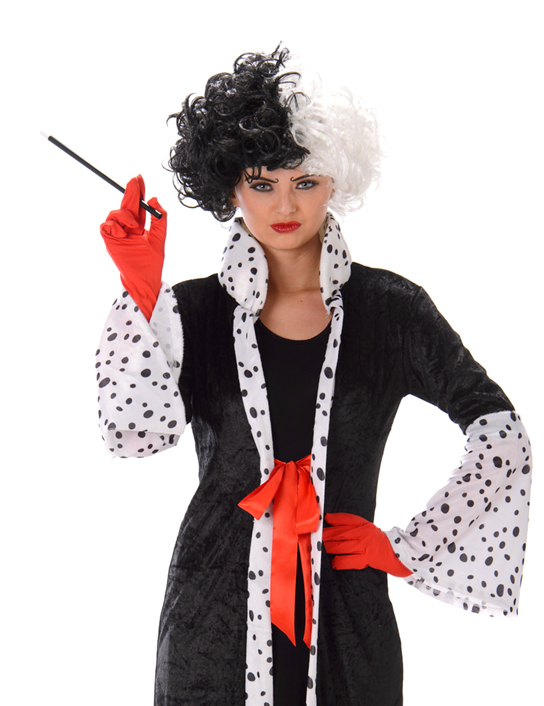 Това костюм на жестока дама Включва палто, перука и ръкавици (цигаретник, рокля и обувки не са включени). Козината е черна с кадифен ефект. с черно-бял далматински принт по средата и долната част на ръкавите. Закопчава се с червена връзка на талията.