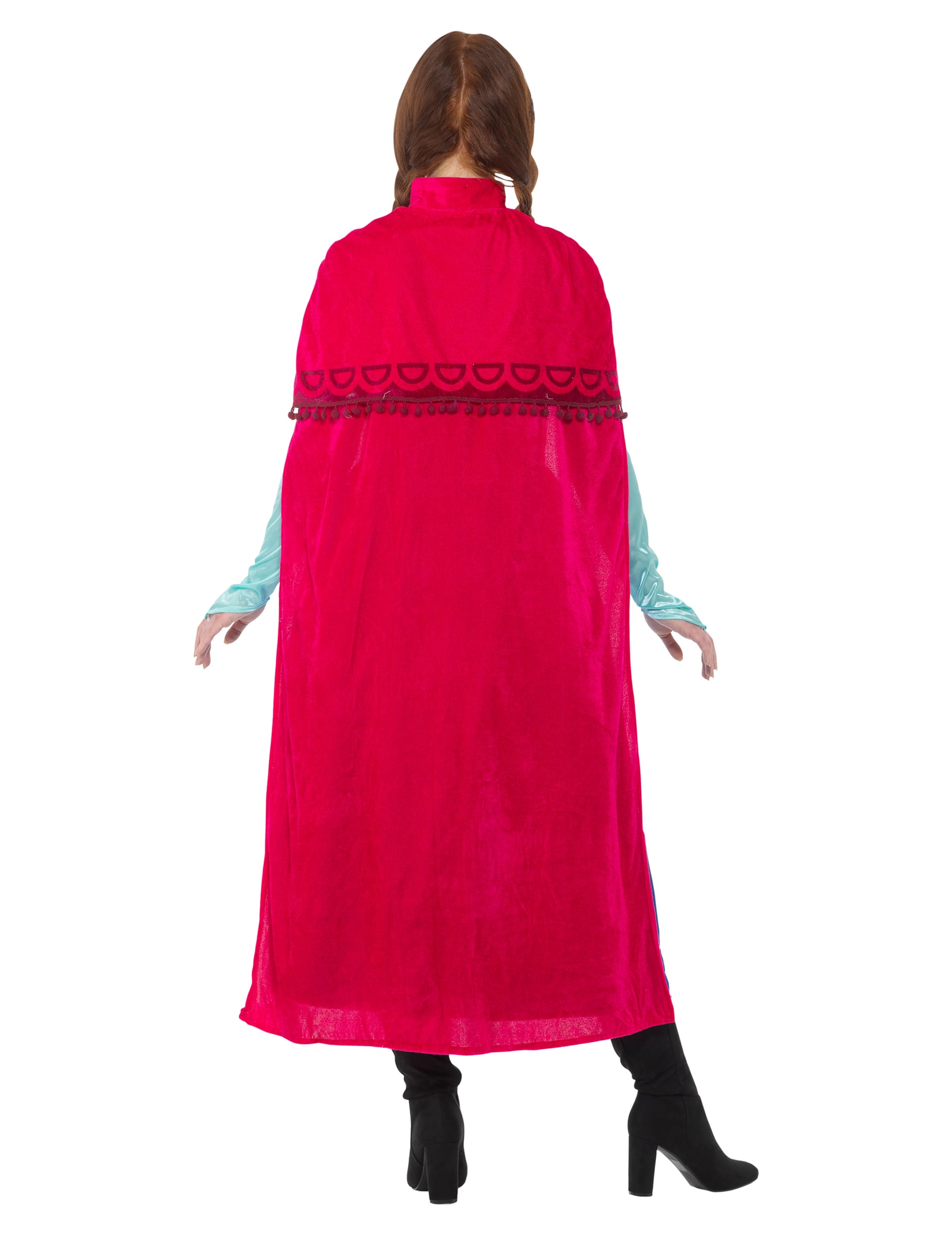 Накрая, нос Тази червена кадифена рокля има двуцветен ефект с помпони! Тя се спуска през раменете и се закопчава с кука около врата, създавайки стилен външен вид. кралски !
