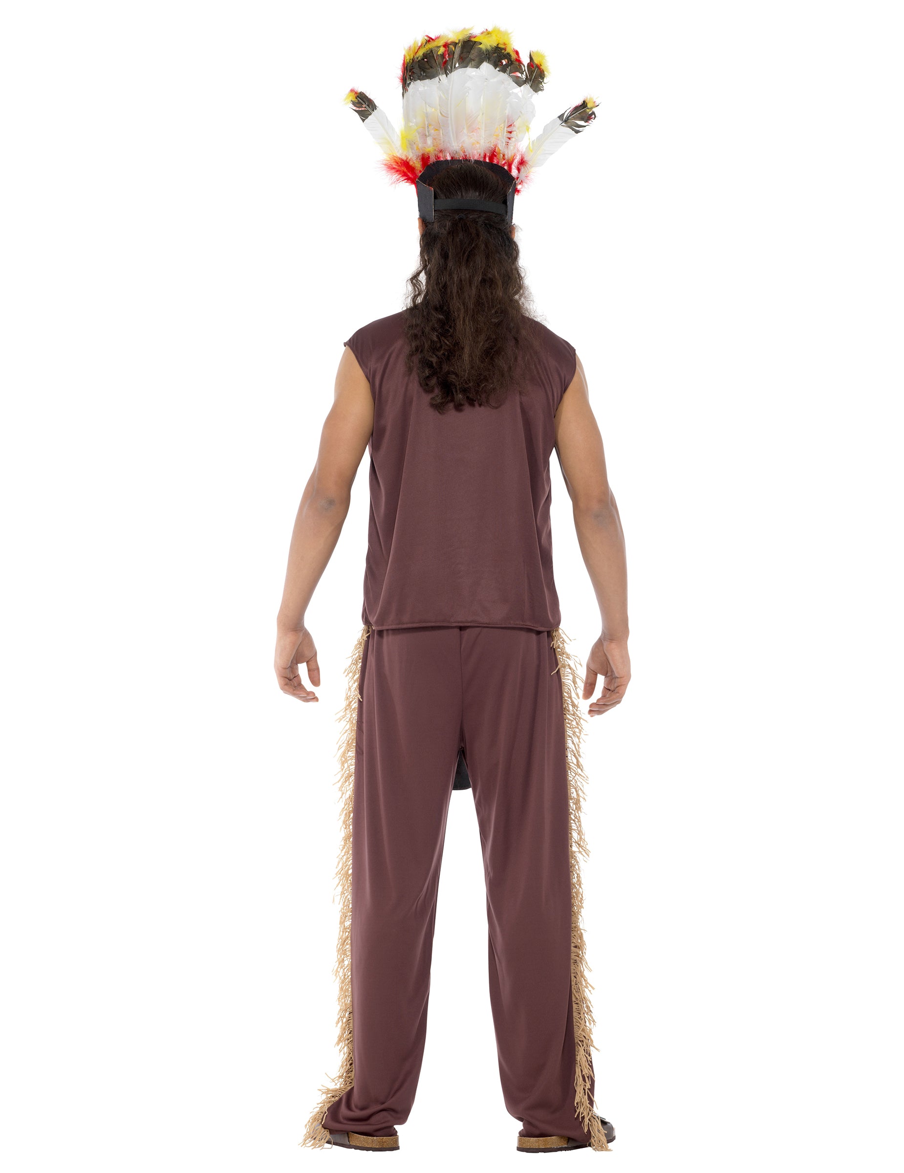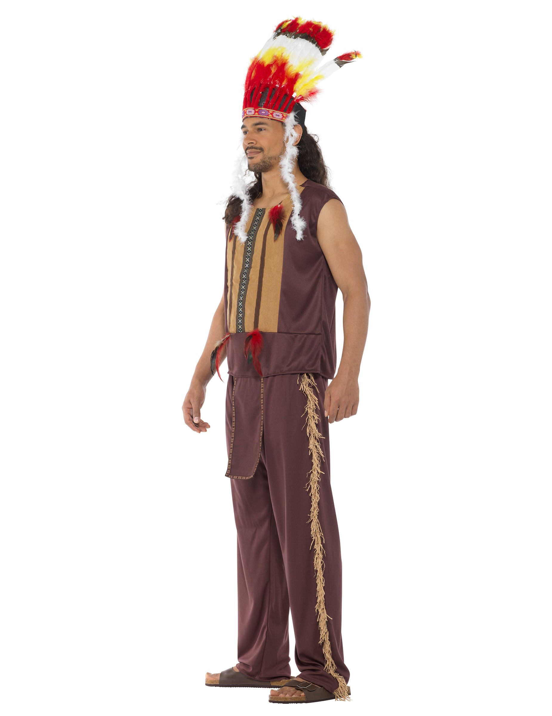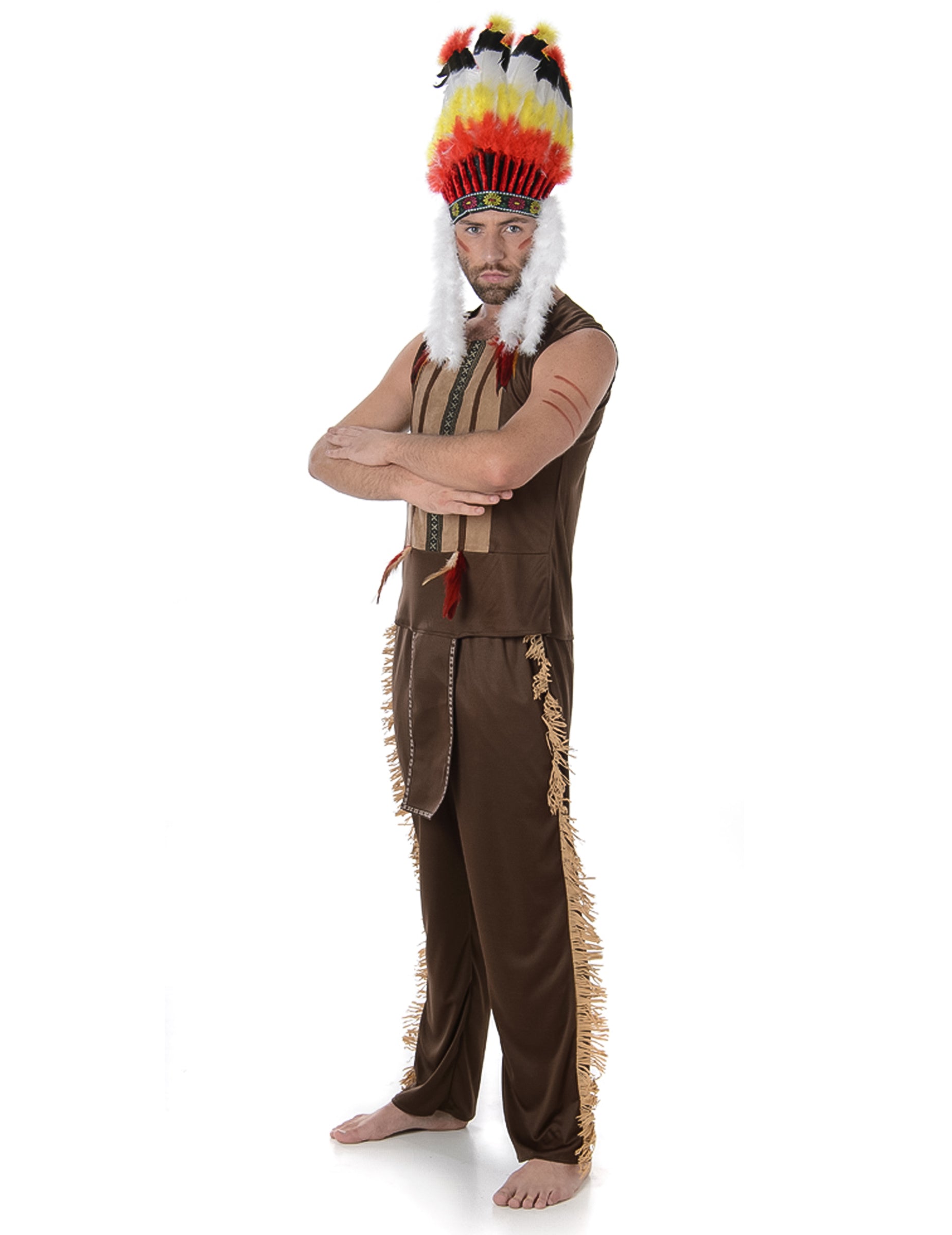 Костюмът на този индийски вожд за мъже се състои от панталони, топ и шапка. Високият връх е тъмнокафяв, с по -лека лента за ефект на кожата отпред. Той е украсен с няколко пера на нивото на шията. Кафявите панталони са еластични в кръста. Той е украсен с малки ресни отстрани. И накрая, шапката на индийски началник идва да завърши това облекло. Тази капачка е украсена с големи цветни пера и е еластична отзад, за да се адаптира към главата ви. Изживейте времето на индианците по време на карнавала или друго празнично събитие.