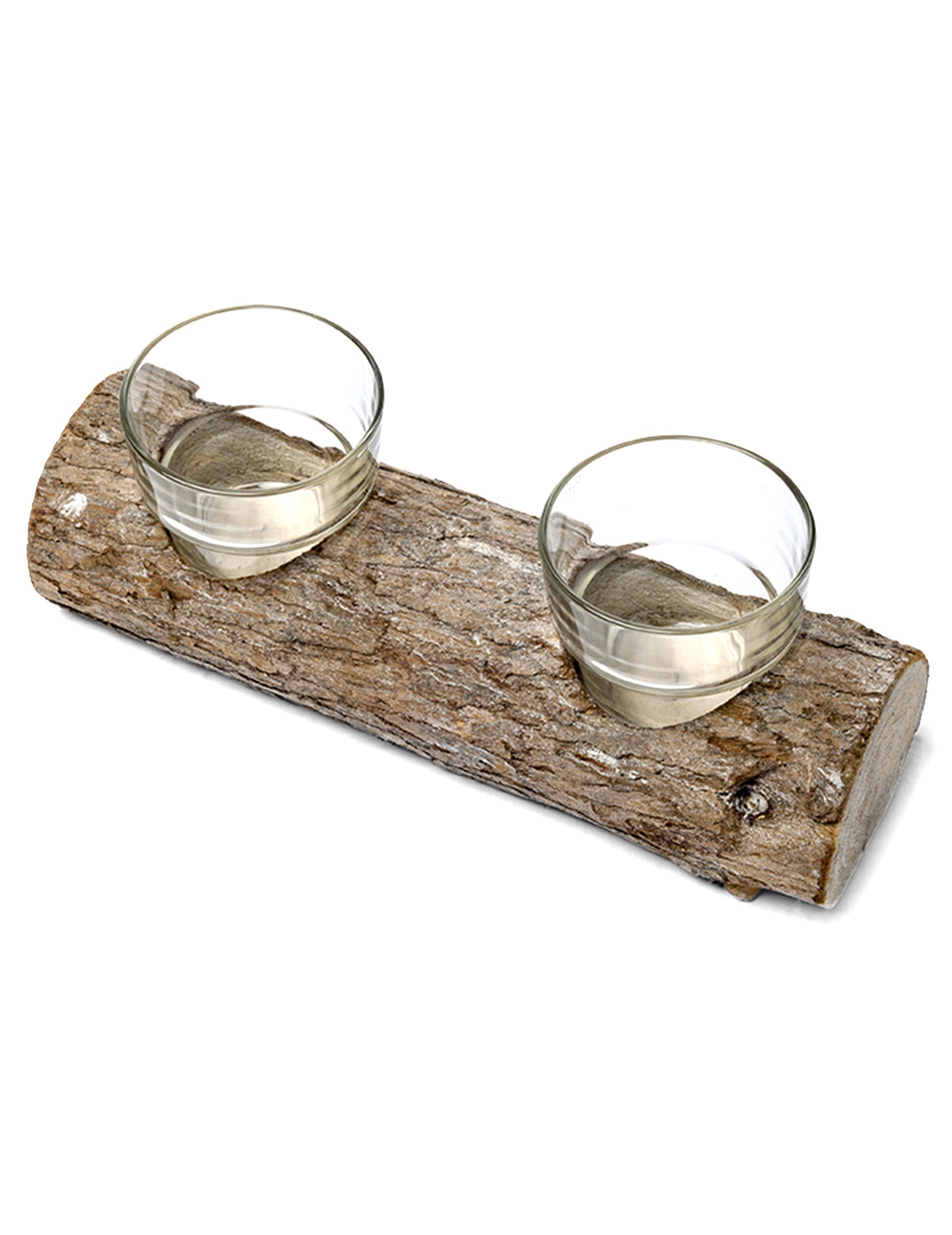 Този великолепен държач за свещи се състои от истински малък дървен труп и две стъклени фотофори. Дървеният дневник е с дължина приблизително 21 см и има две прорези, за да получи фотофорите. Малките очила измерват около 6 х 6 см всяка. Можете да поставите малък нагревател за обувки вътре. Този превъзходен притежател на селски свещи ще бъде идеален за декориране на центъра на вашата маса през зимната вечер или за романтична декорация за вашата сватба. Натурален продукт, който може да има несъвършенства (различен нюанс, възли в дърво, кора, което се откроява).