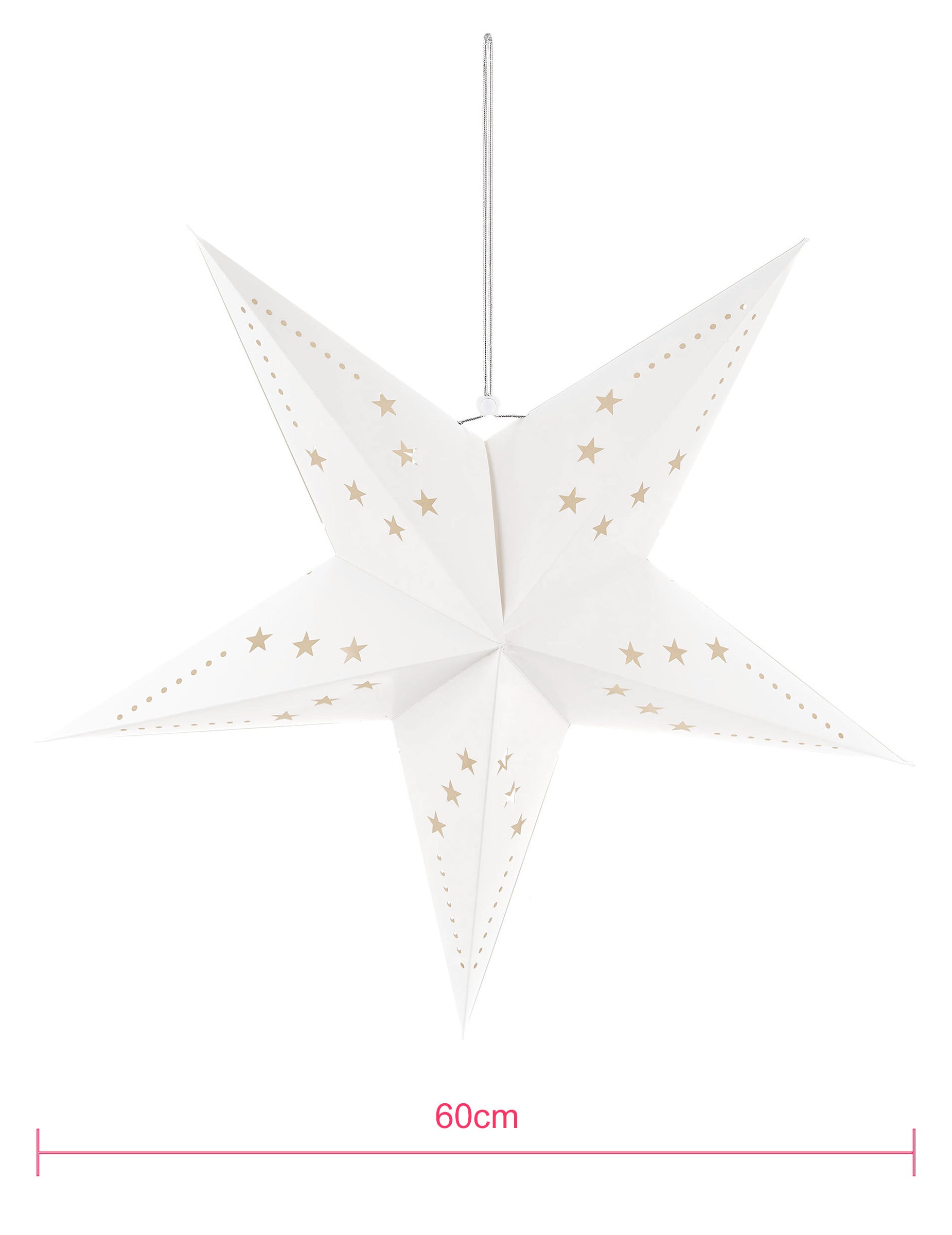 Тази картонена звезда е бяла с място на звезди на нея. Той е с диаметър 60 см и ще бъде разгърнат от вас много лесно. Всъщност ще трябва да снимате само сребърната струна и да я затегнете, за да оформите вашата декорация. За декорация по темата на феята, например или бебешки душ, тази красива звезда ще бъде перфектна!